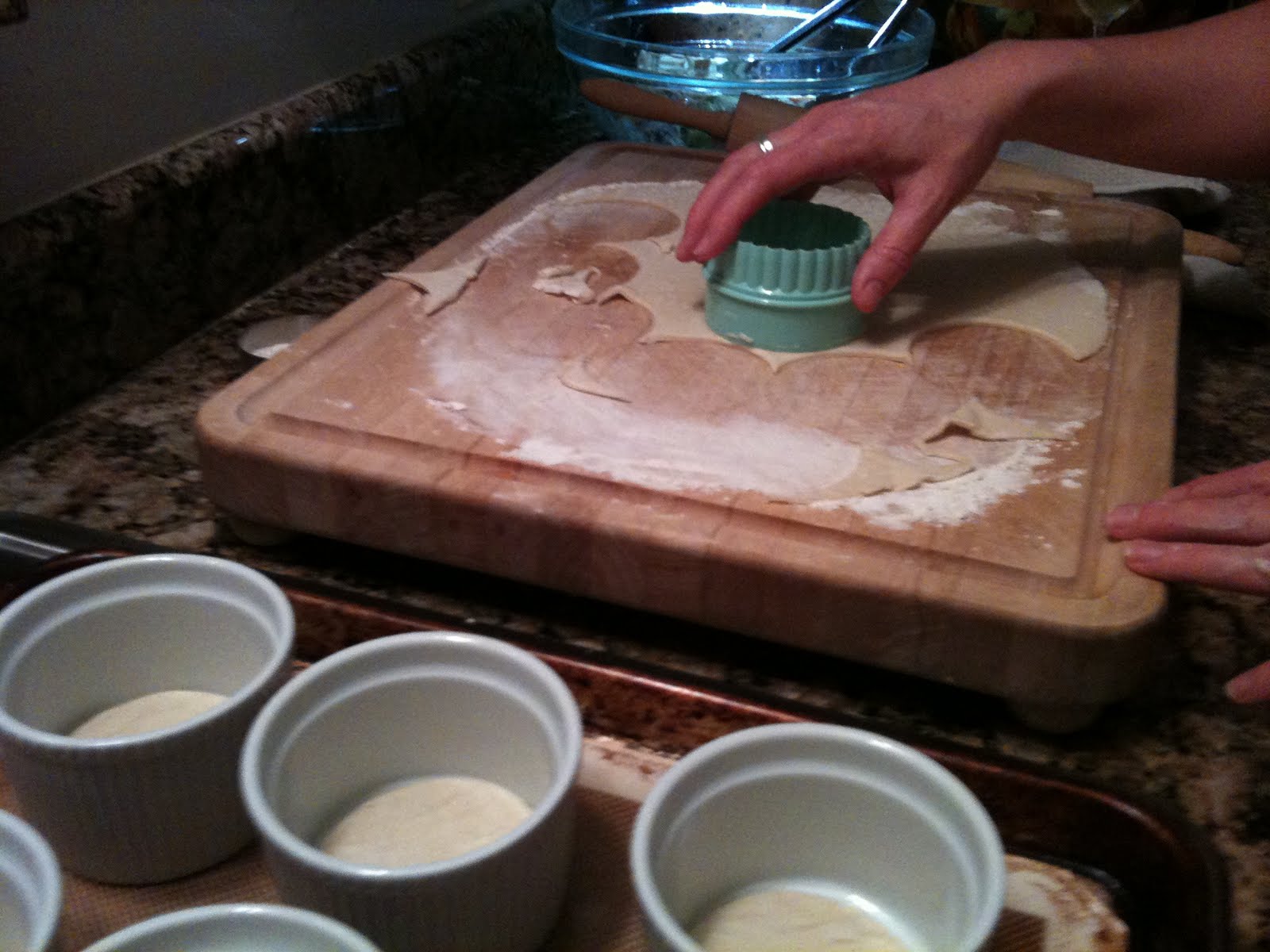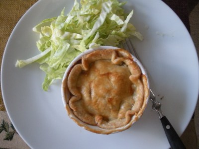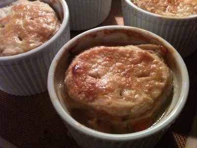 Place each one in the bottom of the ramekin and bake the bottoms for 10-15 minutes or until browned nicely. Cut the remaining pastry into 6 rounds to fit the top of the ramekins, set aside in fridge on a baking sheet.