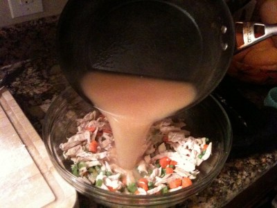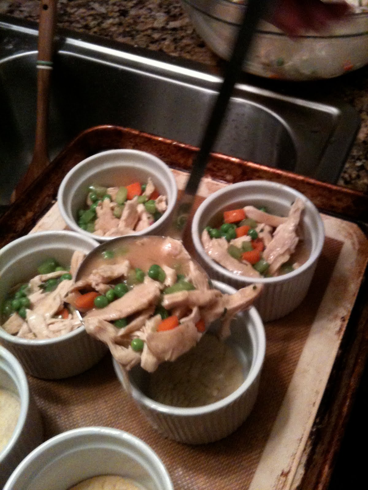 Since the rain continued through out the day, I stayed on the yummy warm comfort food path. I made individual Chicken Pot Pies, a big favorite in my house. I use the pastry dough from Trader Joe’s, it saves on time, but I always make my own chicken stock. There is nothing like homemade stock. Take the time to whip up a big pot and freeze it for future use, you’ll be glad its there. I’ll post my method for chicken stock next.