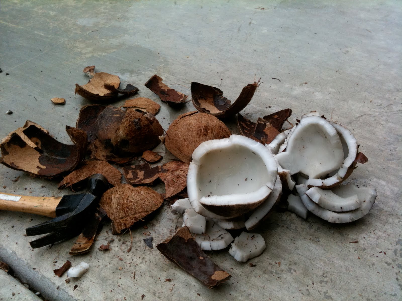 Pour out the coco water, keep or discard it’s not needed for the coconut cream or milk. Bake the coconut in the oven for 375 degrees for 20 minutes, let it cool. Now to the cracking ! Hammer in hand, get to cracking, break off the outer hard shell.