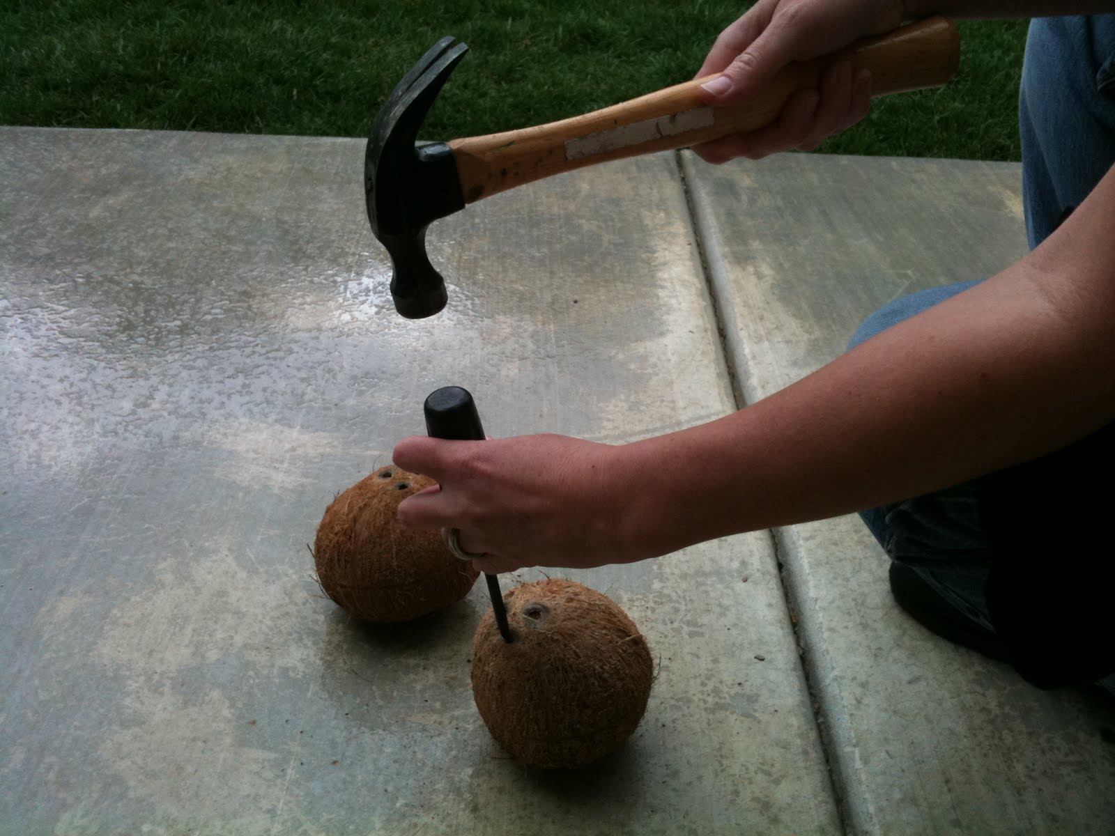 On the top of the coconut are 3 eyes, dark looking holes, take a screw driver and hammer the holes so the screw driver breaks into the coconut.