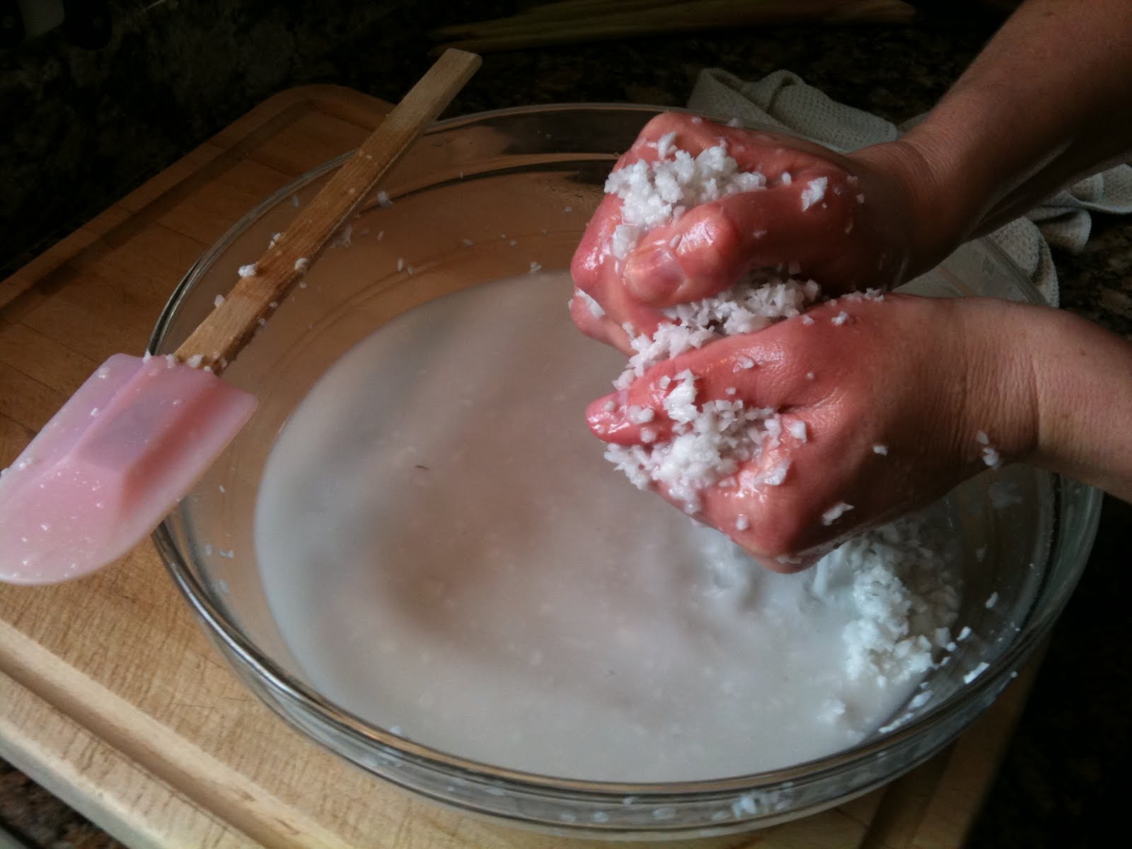 The flesh will have a thinner darker skin that you will need to peel off with a vegetable peeler. Break up the peeled flesh and grind it up in a heavy duty food processor to a pulp. Transfer the pulp to a large bowl and fill with hot water to cover the pulp.