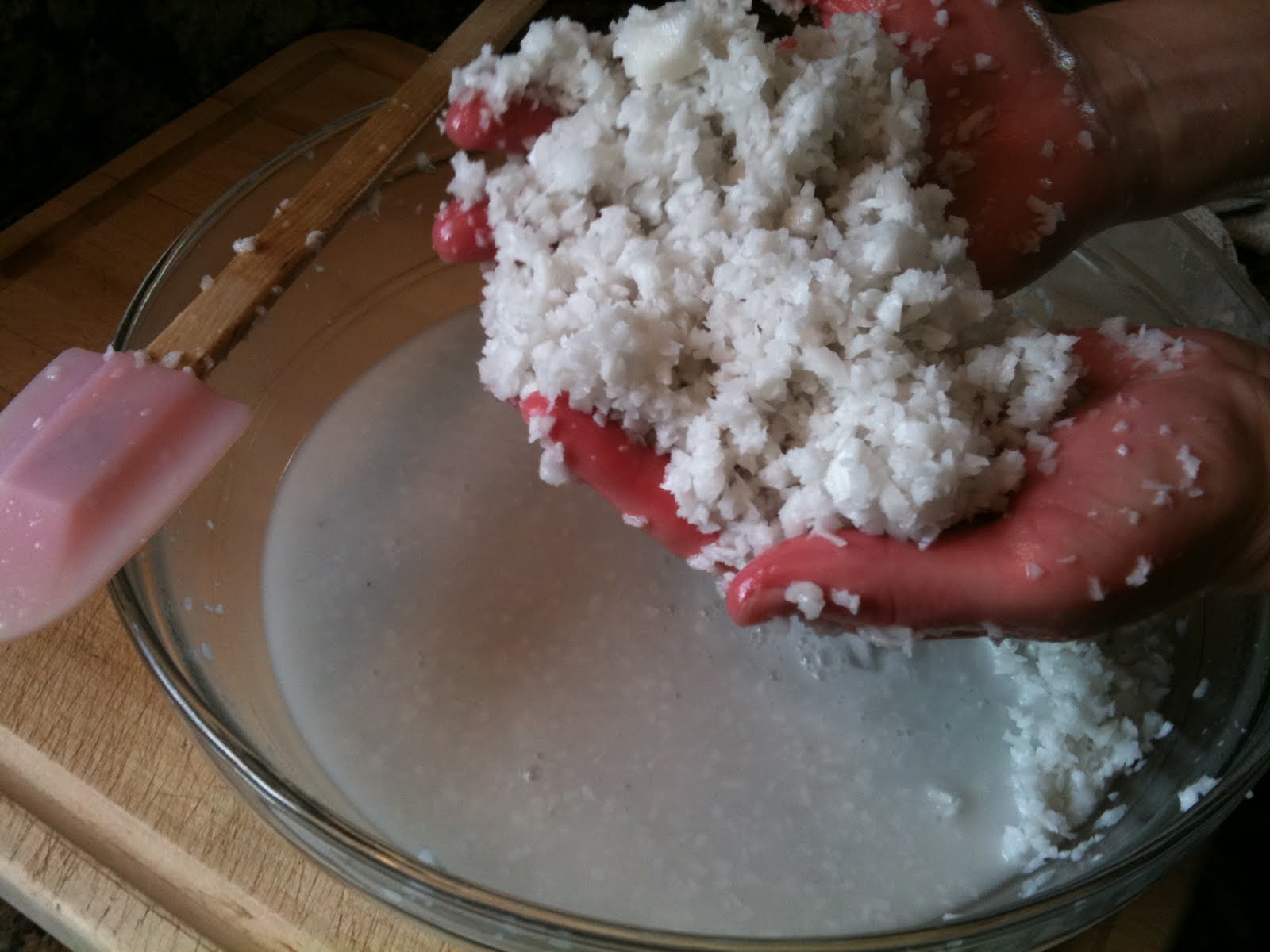 Now it’s spa time, get yours hands in the bowl and massage, squeeze & milk that pulp ! Do this eighty nine times, this is a Thai ritual believed to produce a rich and creamy coconut milk.