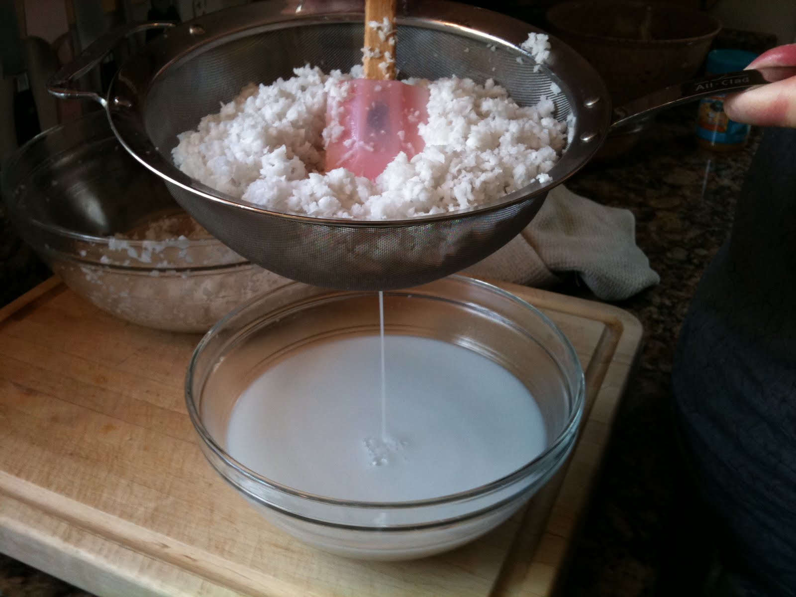It’s great for your skin too, your hands will feel amazing after this. Drain with a strainer into a smaller bowl, all the liquid, this will be the coconut cream.