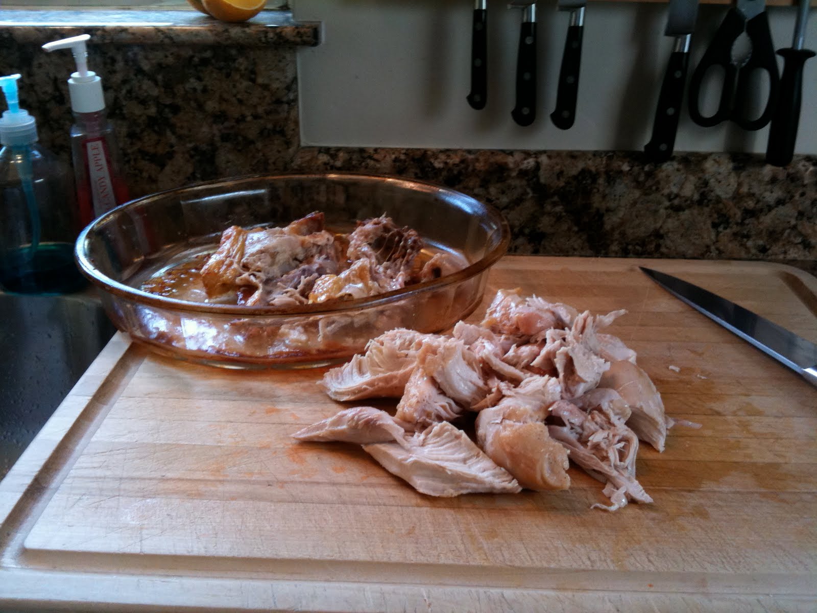 I let the veggies cool to room temp, then I’ll add them to a big mixing bowl with the bells and onions, while I get the chicken deboned.