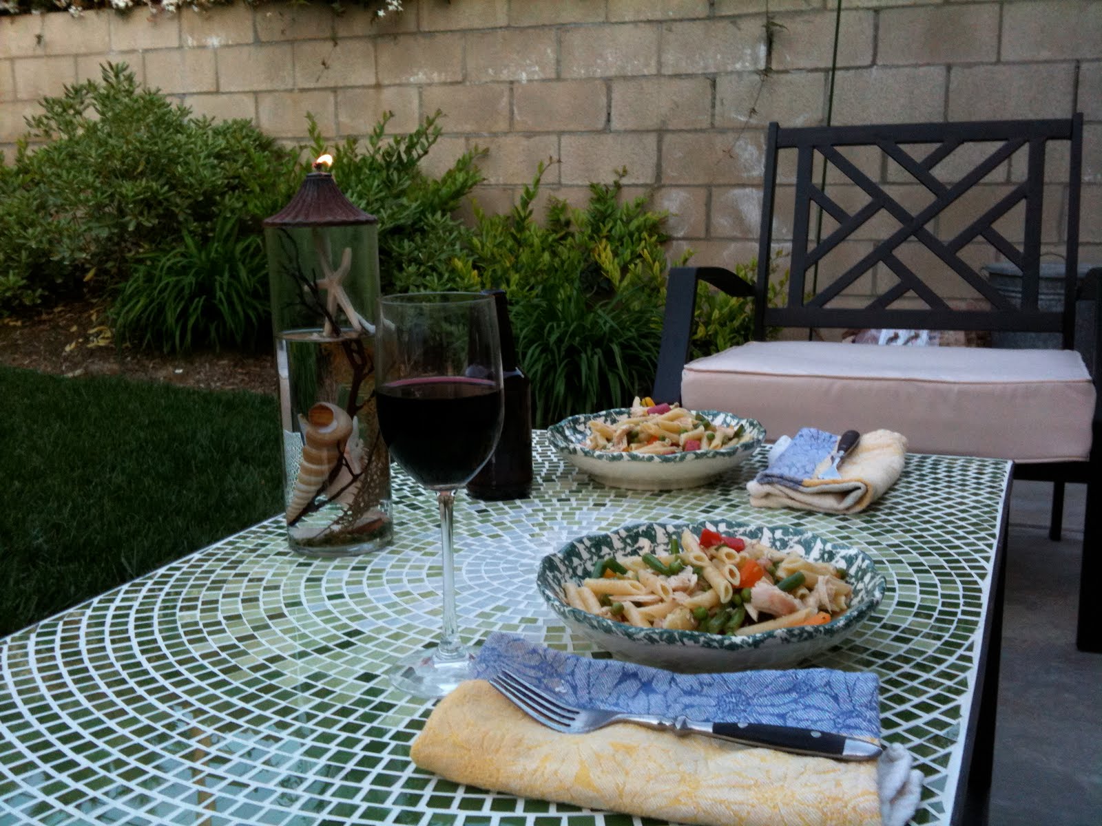 It was totally amazing super warm weather this weekend, so I thought a cool Pasta Salad dinner would be easy and appropriate for outdoor dinning. We are just starting to deal with our backyard, in regards to setting up a space to kick it. We finally got some outdoor furniture !! Love it.