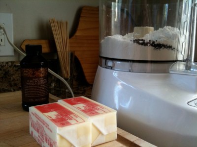 In a food processor, pulse together the flour, tea, and salt, until the tea is just spotted throughout the flour.