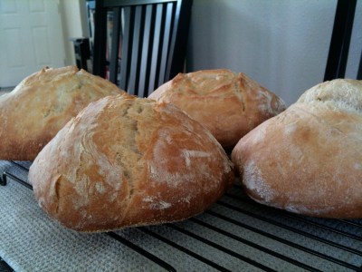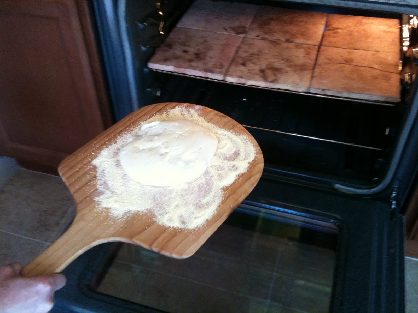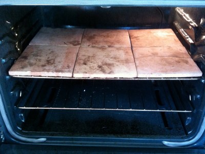 Preheat the oven to 425, with baking stones inside if you have them. These are uncoated quarry tiles we got at a tile store for about $1 each. Way cheaper than the fancy bread stones at Williams Sonoma or Sur La Table. This way you can buy what you need to fit your oven, to create a big flat baking surface for lots of bread.