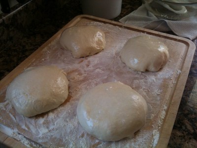 Now the kneading begins. This will take 15 to 20 minutes, with 1 minute breaks every 5 minutes. On a well floured sturdy surface, start to knead the ball of dough. Pushing the heal of your hand in the center of the dough and turning it into itself. Keep your hands floured and add more flour to prevent sticking to the kneading surface. You’re looking for stretchy, smooth non sticky dough when finished. These pictures show the process and how the dough should appear and feel.