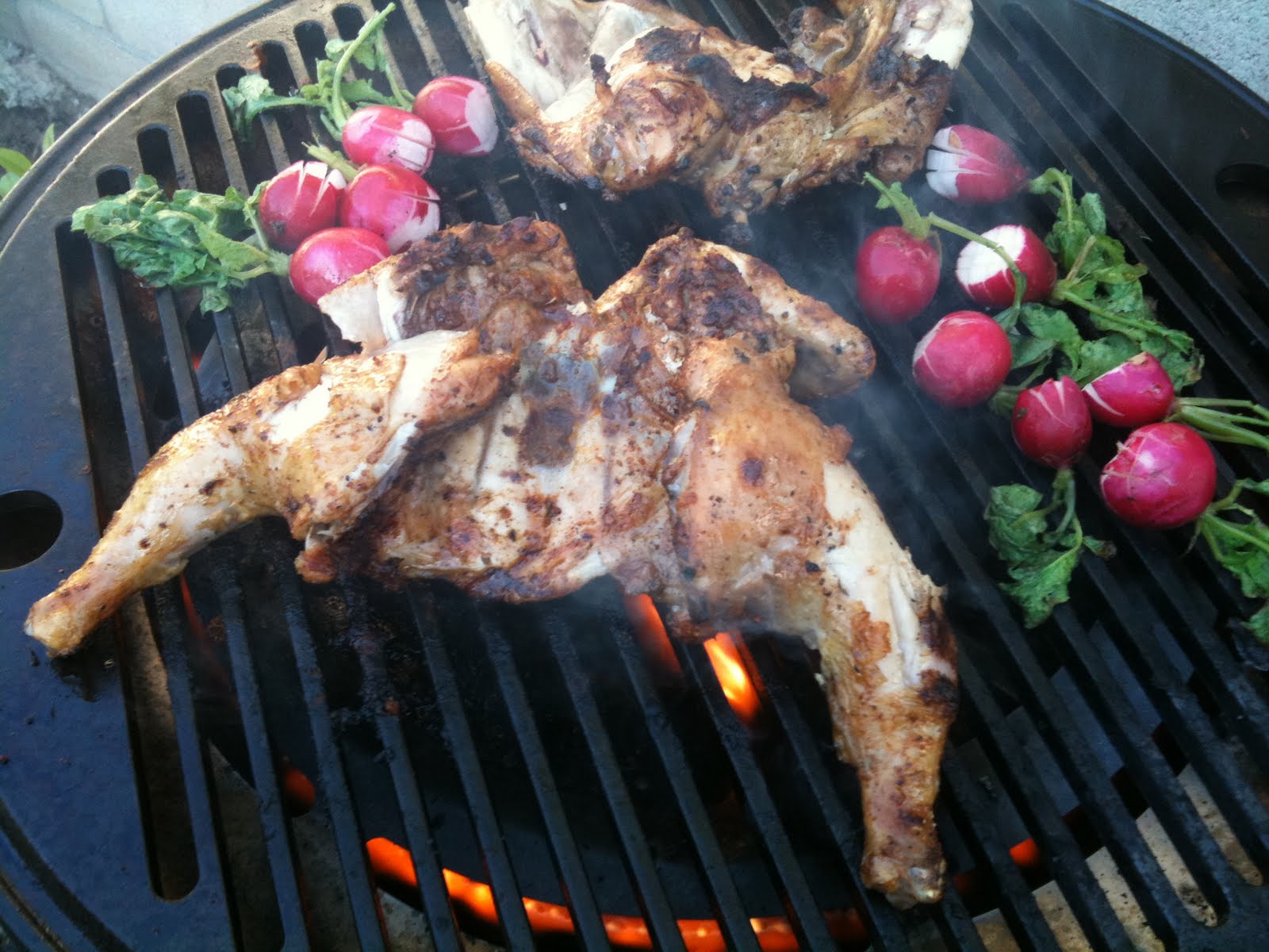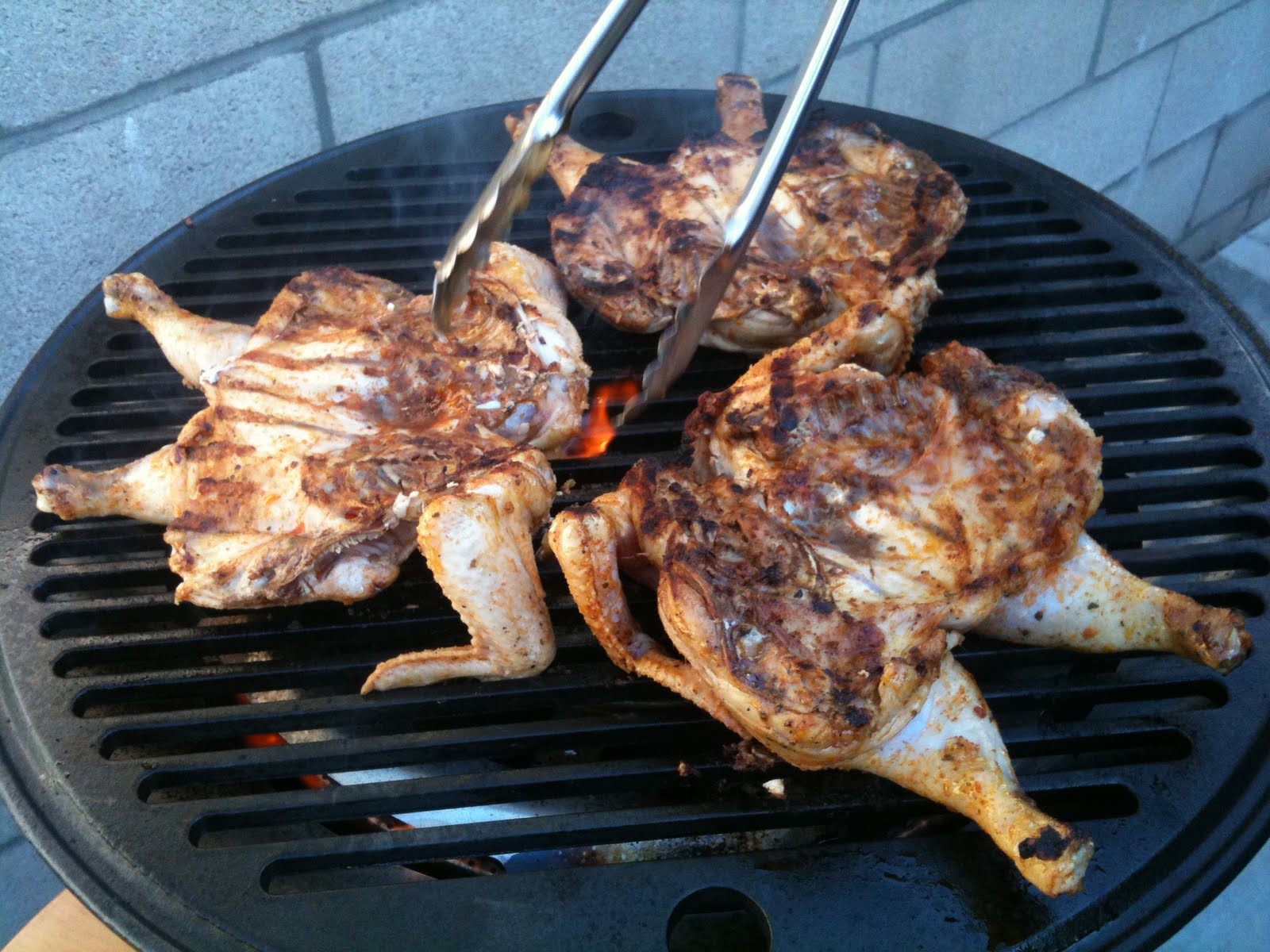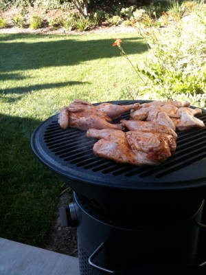 When you’re ready to grill, splay the birds on your hot grill. I did about 8-10 minutes per side until the juices in the thigh areas ran clear.