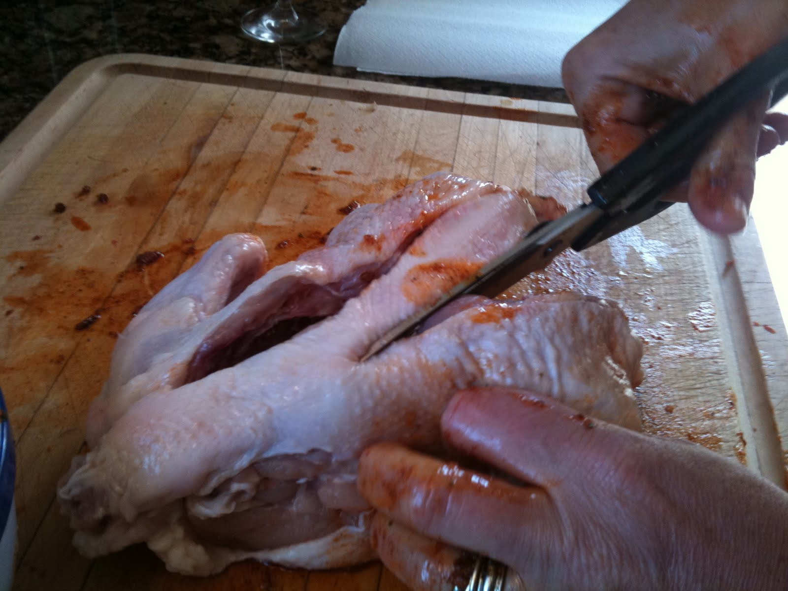 These are small Hens, there were 5 in this box, so I got right to it. I made a marinade and did some research on how to debone them. The deboning seemed a bit fussy for a grilled item so I opted to remove the back bone only and splay them out butterfly style.