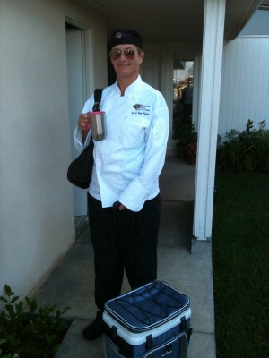 Me in my uniform ( I wear this everyday with the hat ), with my wheelie cooler. Love the clown pants, too bad you can’t see my Mickey Mouse shoes, they’re awesome.