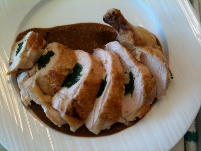 Chicken Breast stuffed w/ saute’d Spinach and Goat Cheese atop Sauce Robert.