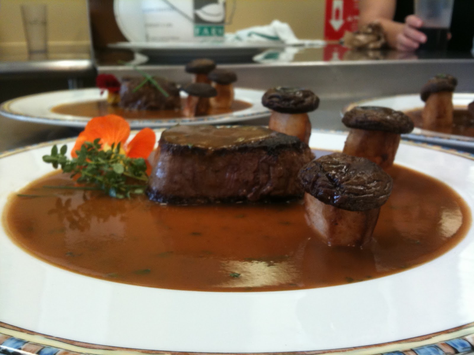 Petit Filet Mignon – Chateaubriand Sauce, the funny looking toad stools are tourned, a fancy way to cut potatoes, with Shitake mushroom tops.