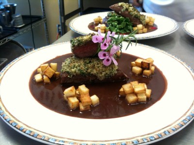 Crusted Lamb Loin, Roasted Potatoes with Marchand de Vin Sauce.