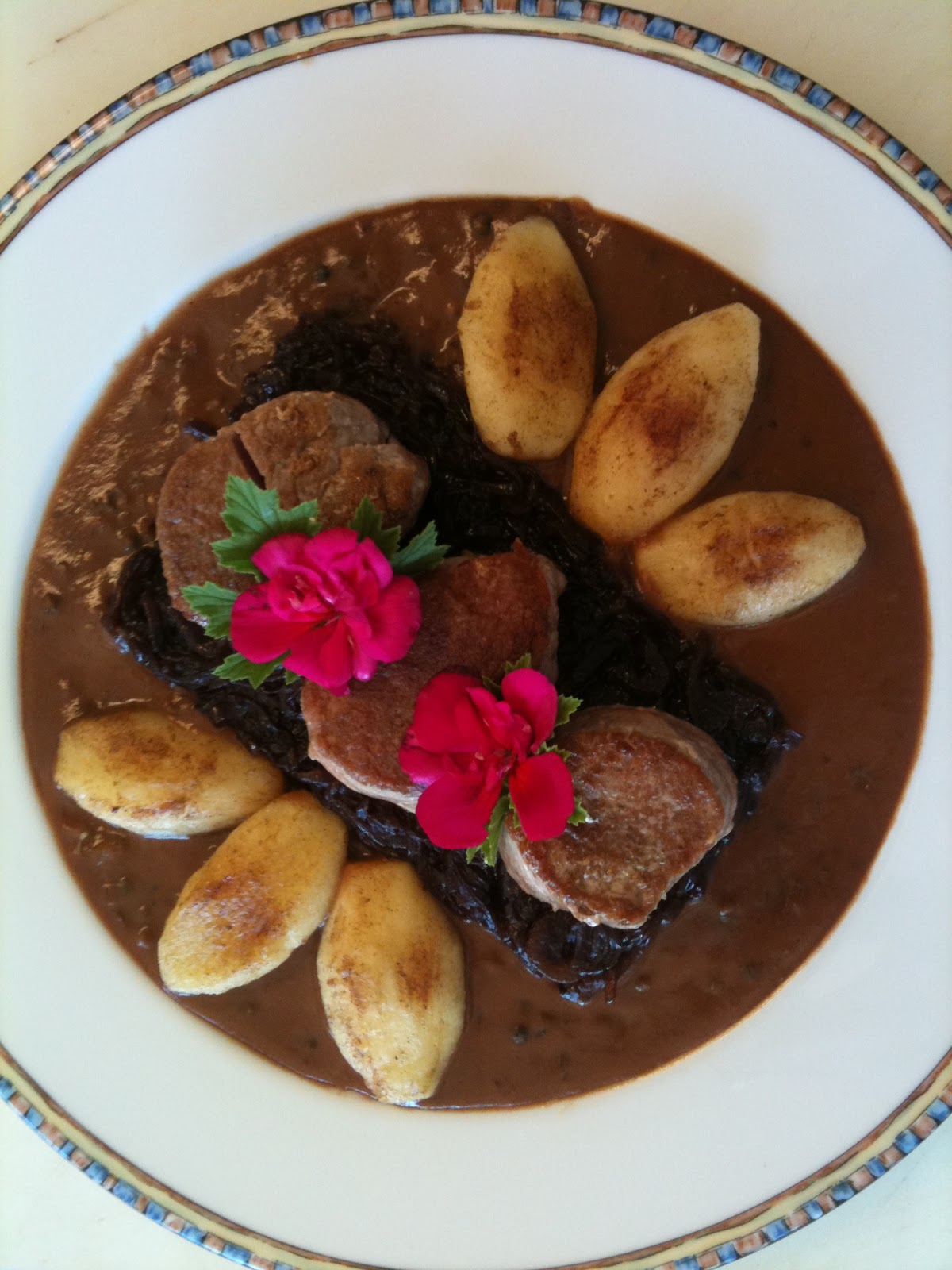Pork Medallions atop Red Onion Confit, Baked Apples with Green Peppercorn Sauce.