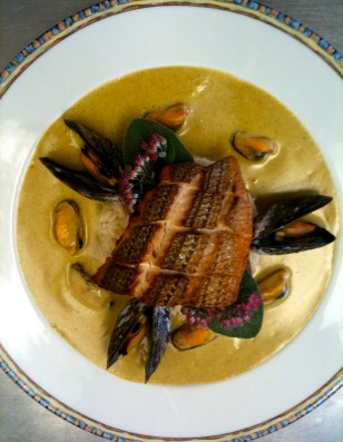 pan seared Sea Bass on rice pilaf with Mussel sauce