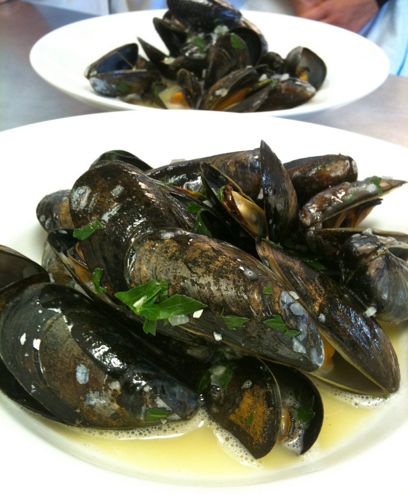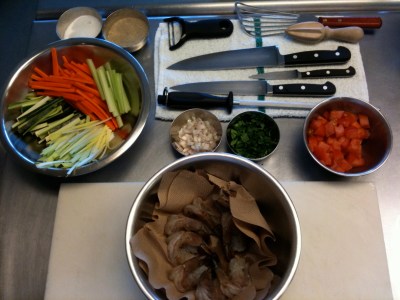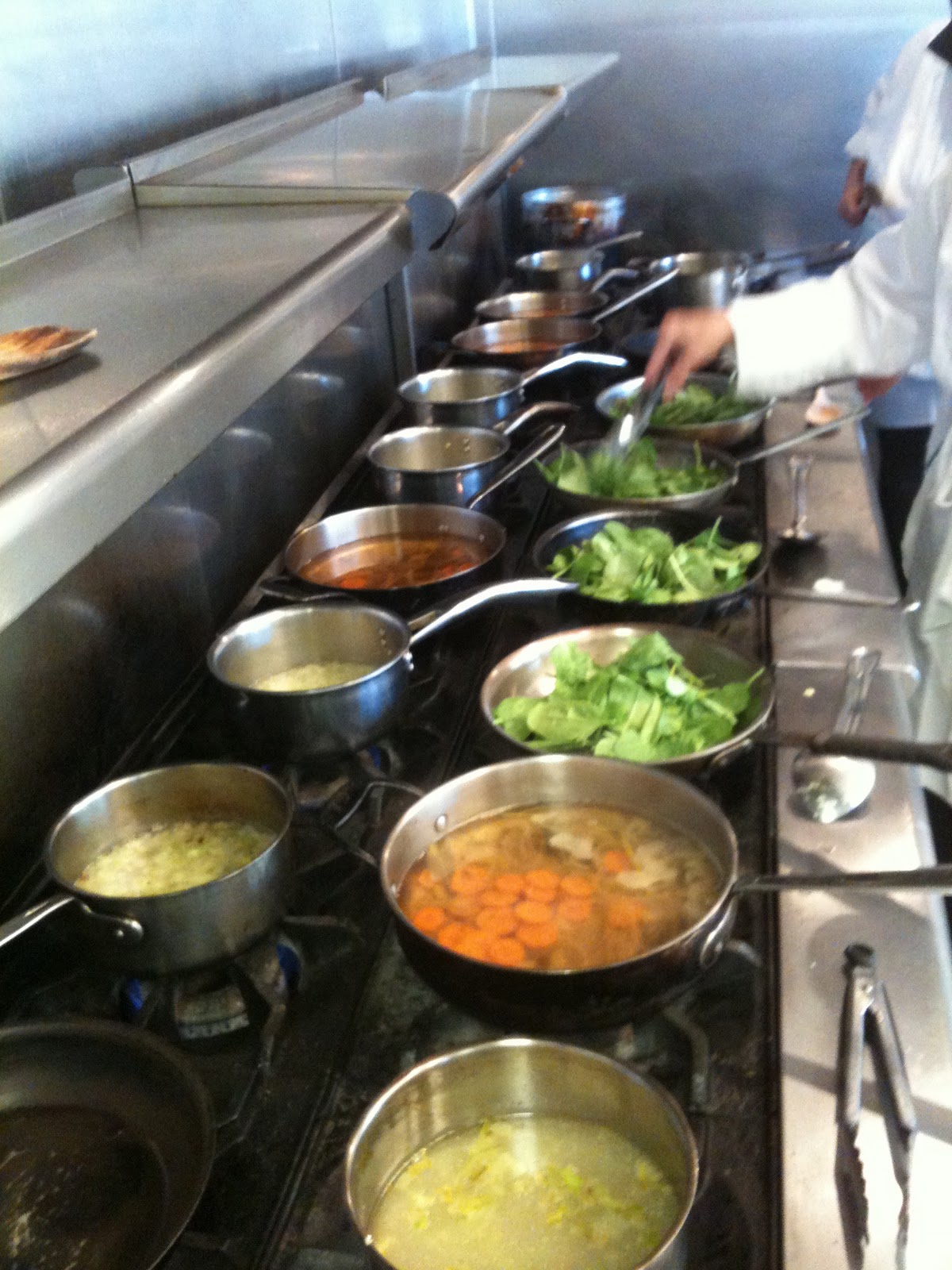 the line in action- court bouillon (for poaching Halibut) -Veloute sauce- saute’d spinach