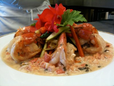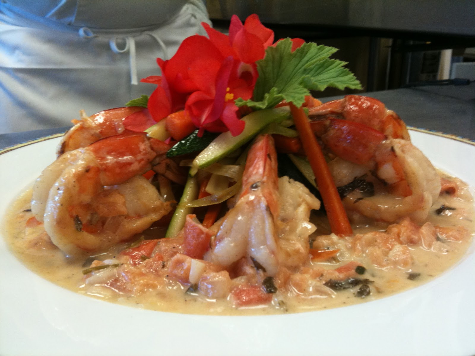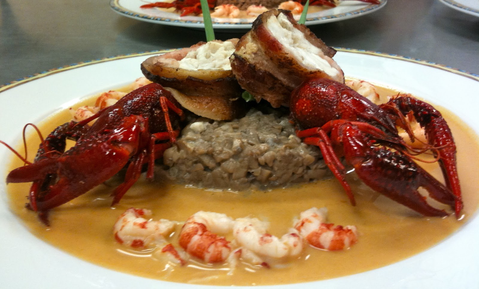 This is bacon wrapped Monkfish, atop Mushroom Duxelle in a Crayfish aka Crawdad sauce.