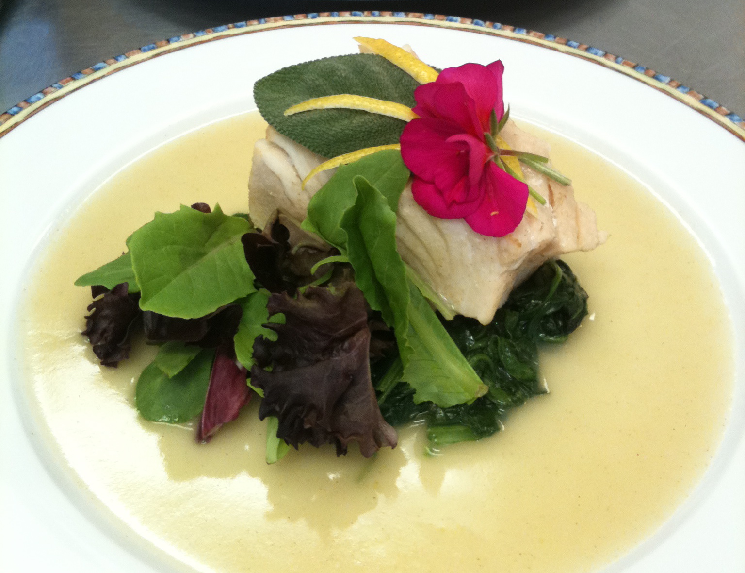 poached Halibut atop saute’d spinach with Veloute sauce.