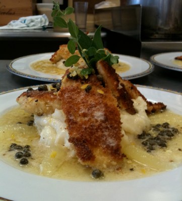 This is breaded Red Snapper atop mashed potatoes in a butter caper lemon sauce.