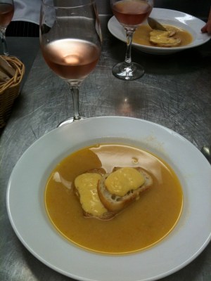 This is the first course for the La Bouillabaisse Provencal, croutons with Rouille sauce on them as well as a lovely Rose from France.