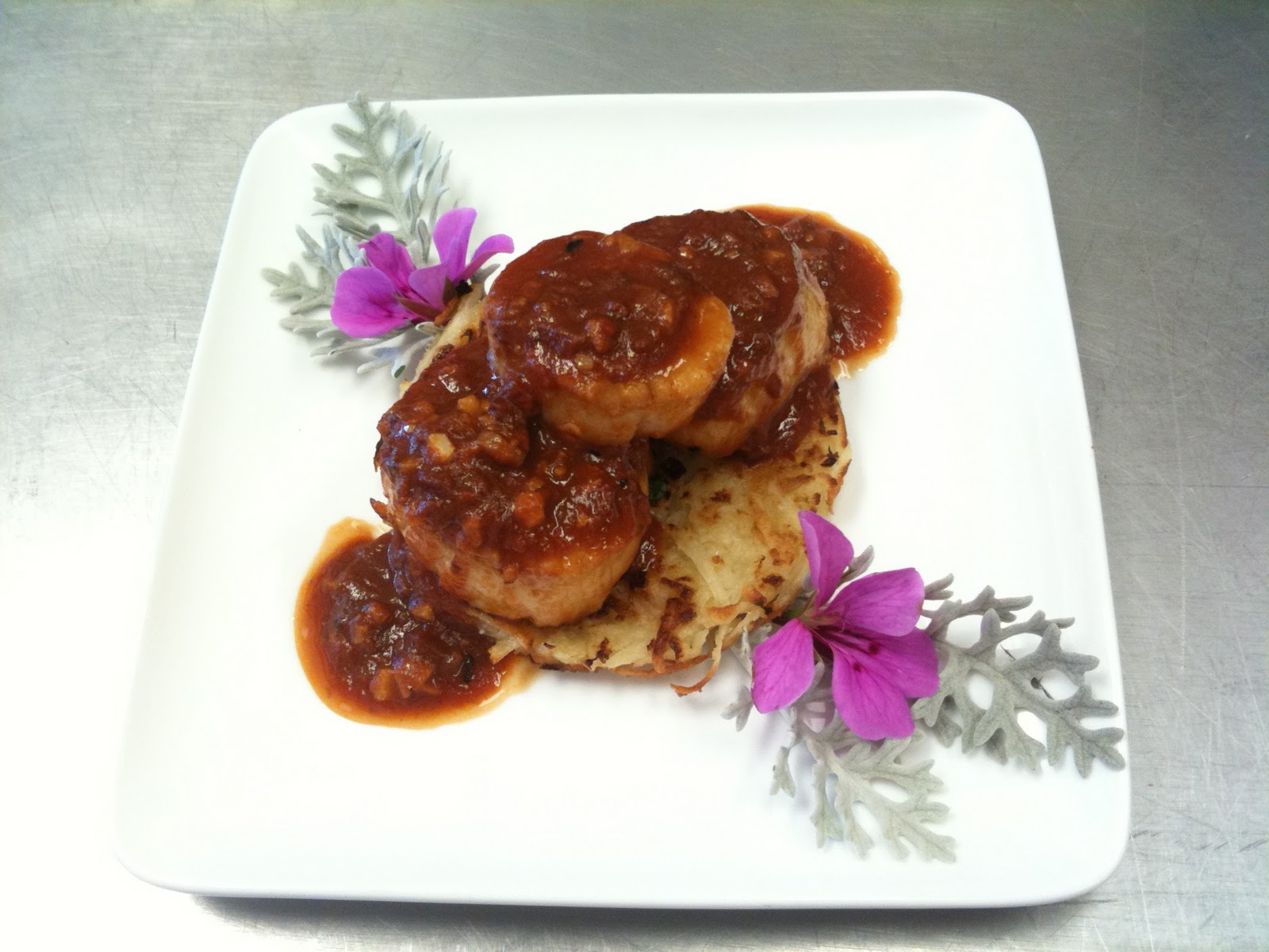Scallops atop Potato Rosti w/spicy tomato sauce