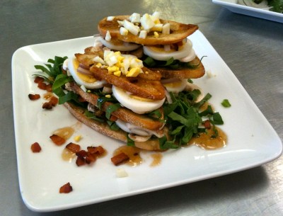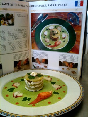 rounds of artichoke hearts, filled with mustard whip cream, chopped lobster and artichoke hearts, floating in saute verte with lobster medallions and claw meat