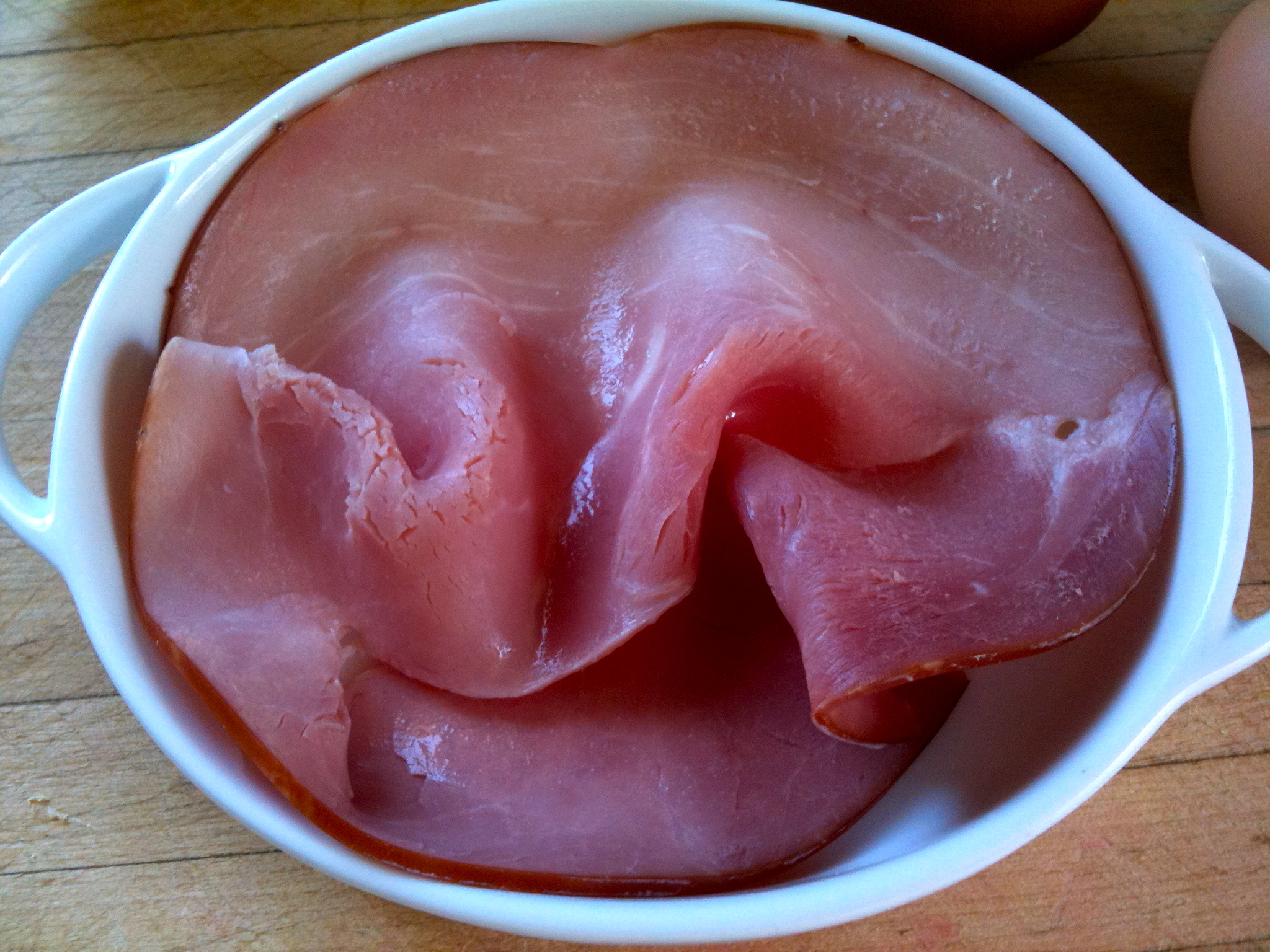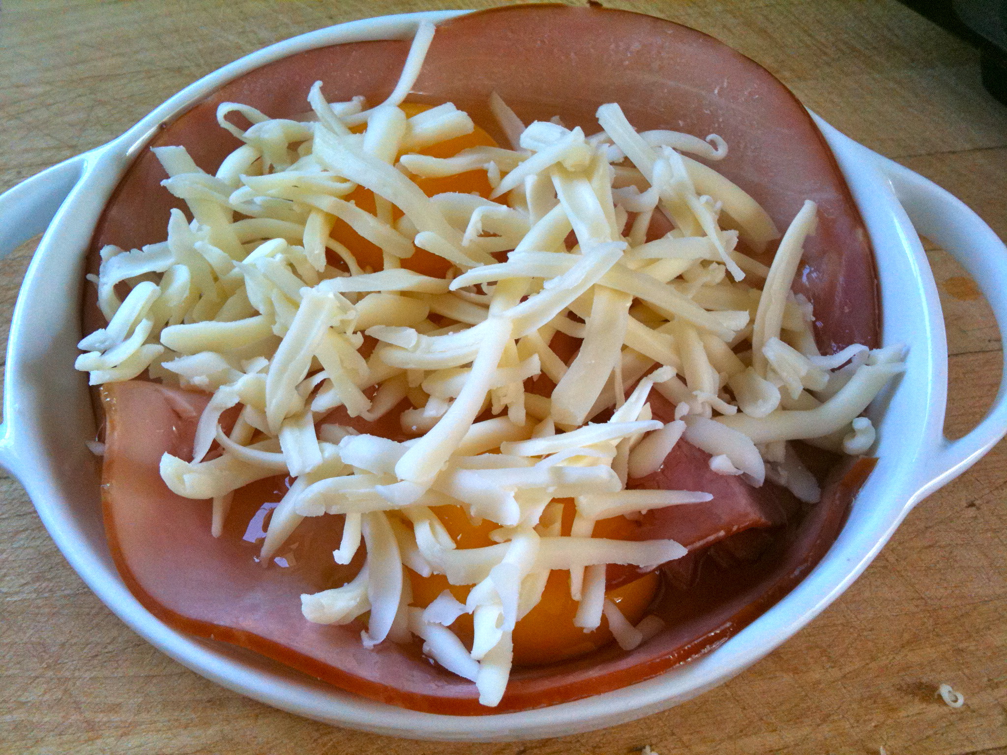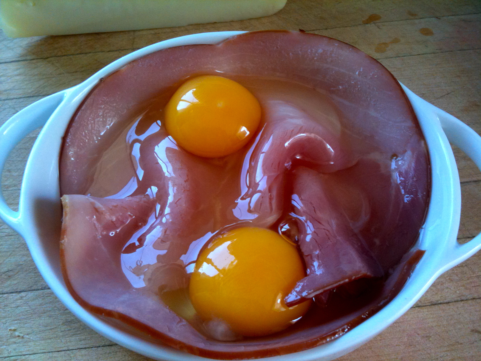 Add the ham first then crack the eggs whole over the ham. If you’re not using meat, simply crack the eggs over the hot cream and butter.