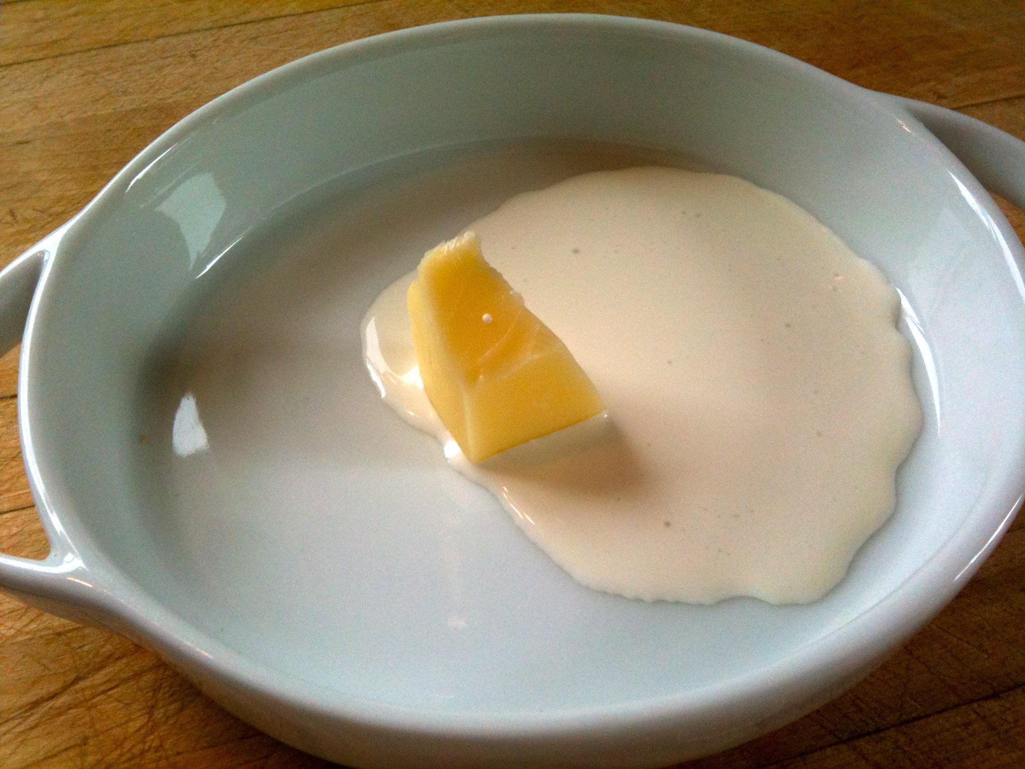 Let’s get started, preheat your oven to 450, place your gratin dish on a baking sheet, add 1 T of butter & 2T of heavy cream to each gratin dish.