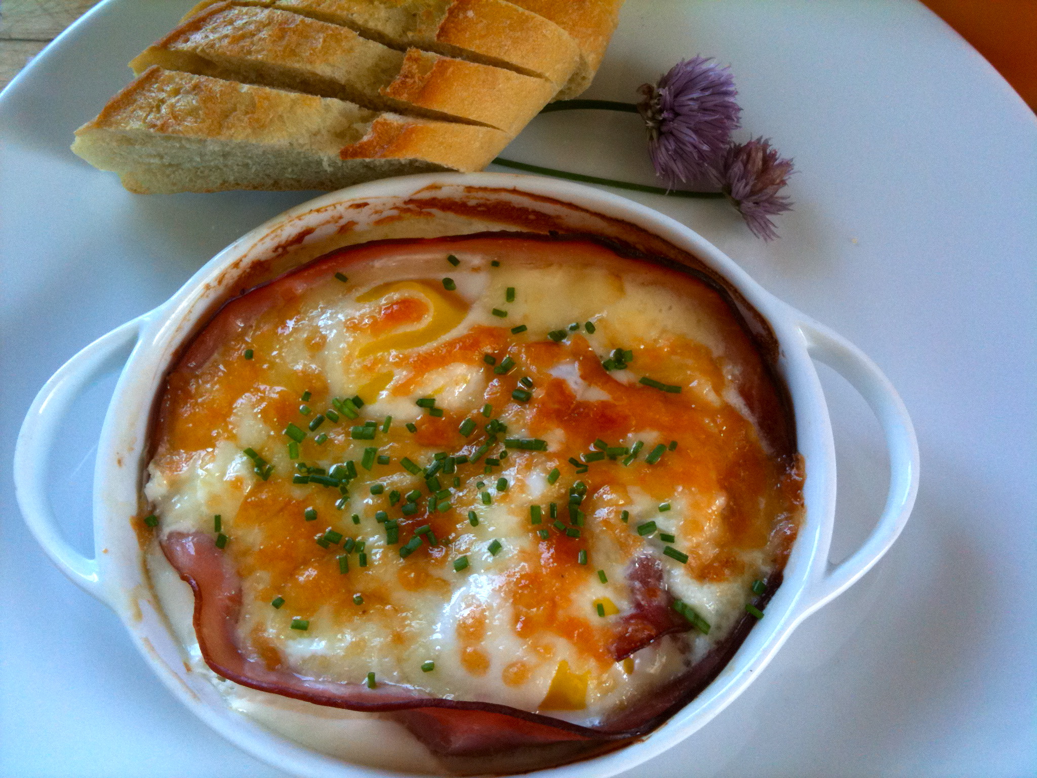 Individual gratin dishes, Eggs, Cream, Butter, Cheese, S/P,fresh chopped herbs, chopped shallots and or chopped garlic.