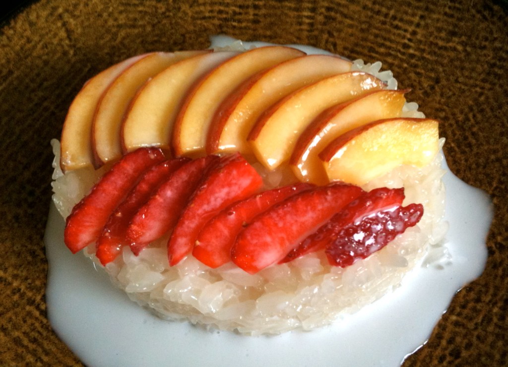 To serve, place warmed rice portion a plate – ladle a small amount of warmed syrup #2 over the top – place fruit on top or to the side – ladle a bit more syrup over the fruit. The combo is amazing, the salty sweet coconut of syrup #2 is the prefect balance for the sweet sticky coconut rice and the tart sweet fruit.