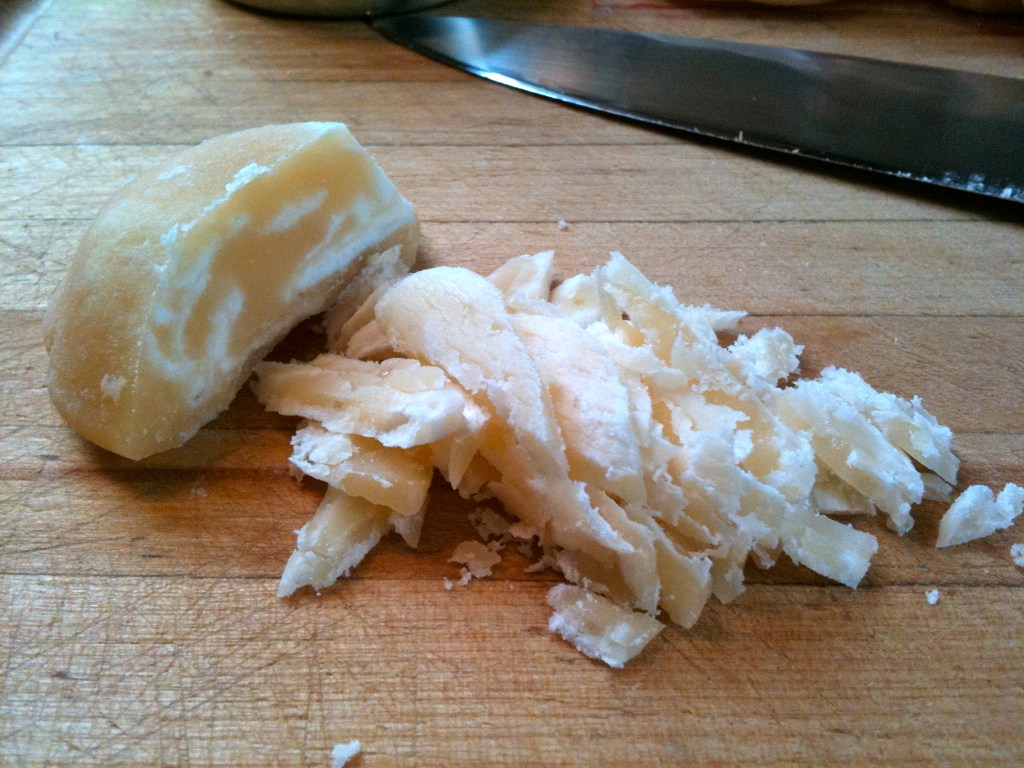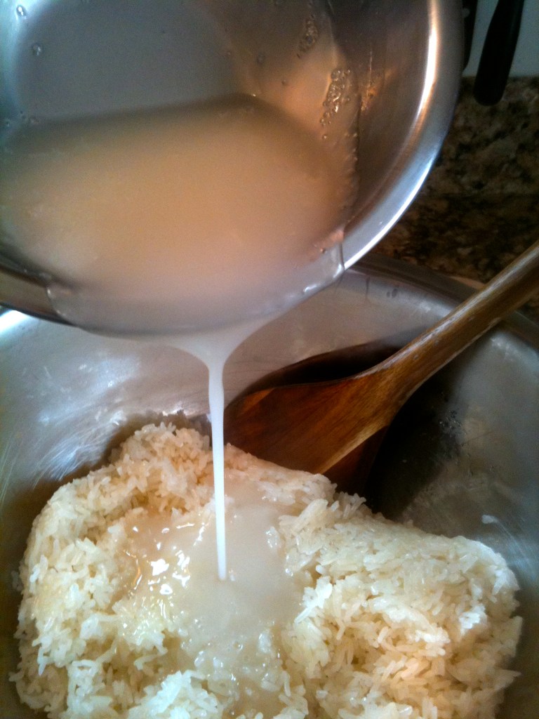 It comes in these little hard rounds, you ‘ll need to chop them up a bit so they melt nicely. Cook the syrup on a low heat for about 10 minutes, don’t let it boil- you want to see steam but no boil – add the extract at the end of cooking. Keep warm and set aside. When the rice is done and still very hot, transfer to a mixing bowl and add the warm syrup #1