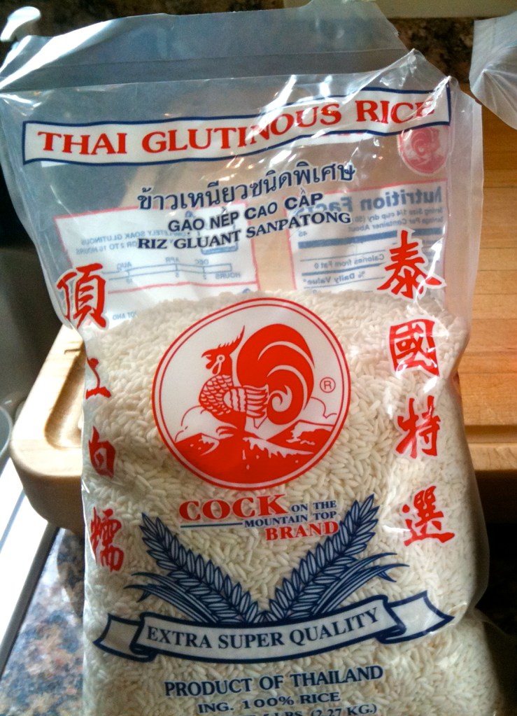 This is the traditional pot and basket used for sticky rice – most Asian markets will have these and they are super cheap – the set cost me under $10. If you don’t want to get all silly like me and buy more stuff that you have to store in a kitchen that is packed out already – this will live in my garage which I’m slowly taking over with kitchen gear – poor Jim – you can use a pasta cooker/steamer basket. If you use the pasta pot – line the steamer basket with dried corn husks – the ones you use for tamales – oil the husks a bit so they don’t stick to the steamer insert. You MUST soak the rice over night, the quick boil method does not work on this rice.