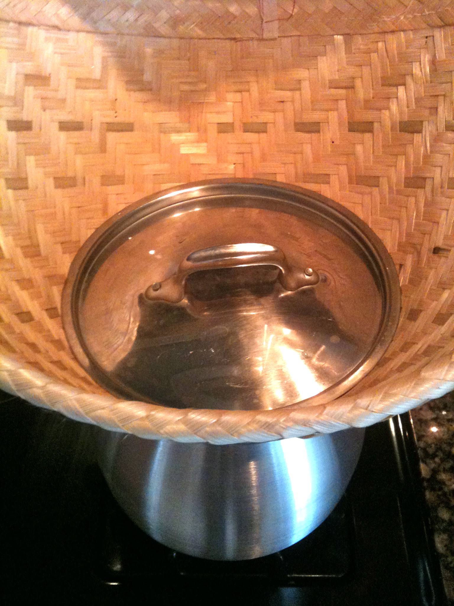 Fill the basket with the soaked rice and rinse several times. Place the basket over the pot with boiling water. Cover the rice with a pie pan or a lid that will fit down in the basket – as close to the rice as you can.