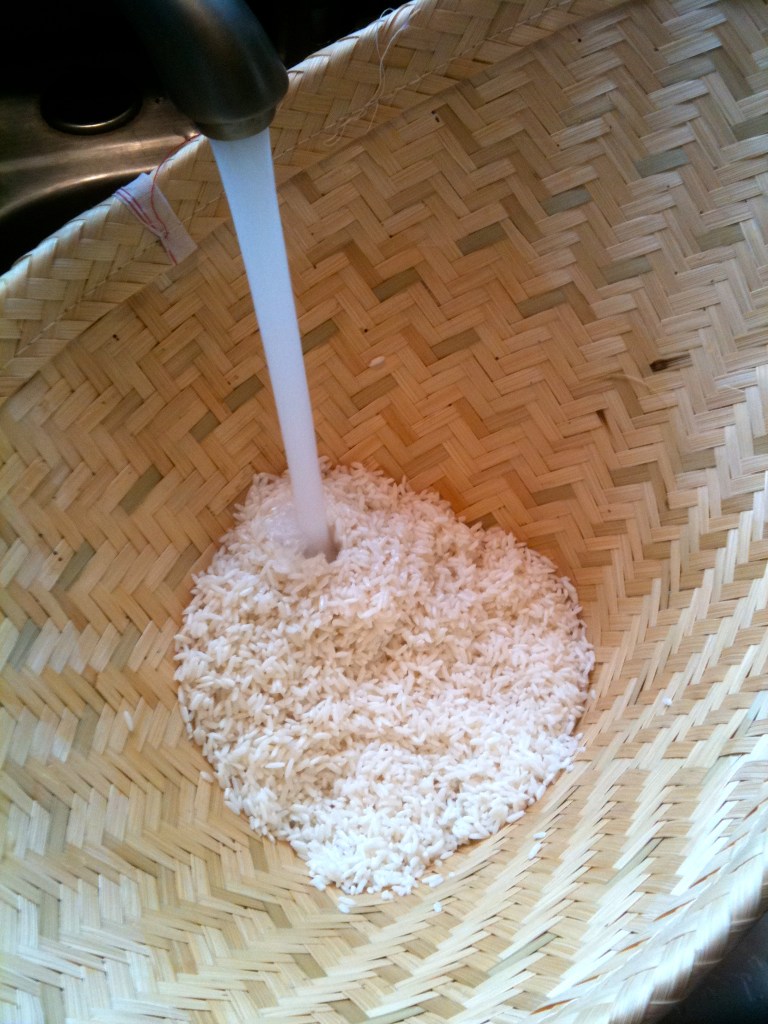 You will need to find long grain Thai jasmine rice or glutinous rice – the above is the brand I found at a huge asian market in San Diego. Ask for help if you can’t find it, tell them you’re making sticky rice, you’ll get hooked up with the right stuff. Next how to cook this magical rice.