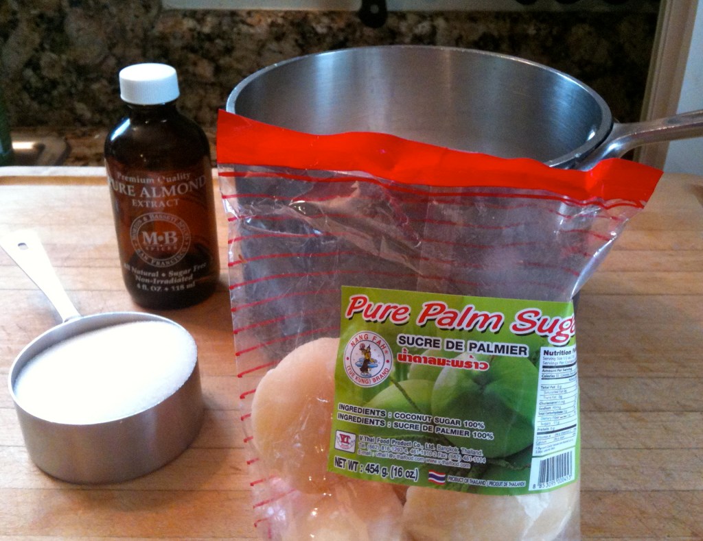Syrup#1 – sauce syrup – in a small sauce pot combine 2 cups coconut cream/milk combo fresh or canned -1/2 cup sugar – 4 Tablespoons Palm Sugar or brown sugar – couple drops of almond or orange extract added at the end of cooking.