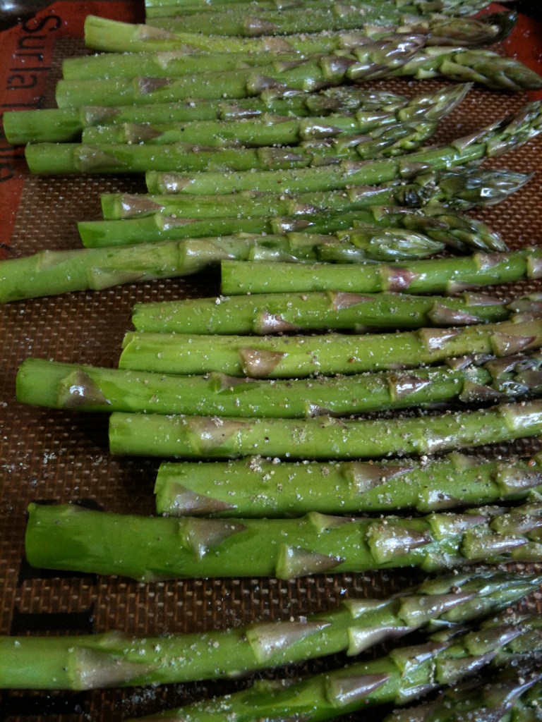 To roast Asparagus, toss with a small amount of olive oil, salt and pepper. Line baking sheet with a single layer of asparagus and roast for 15 minutes at 375.