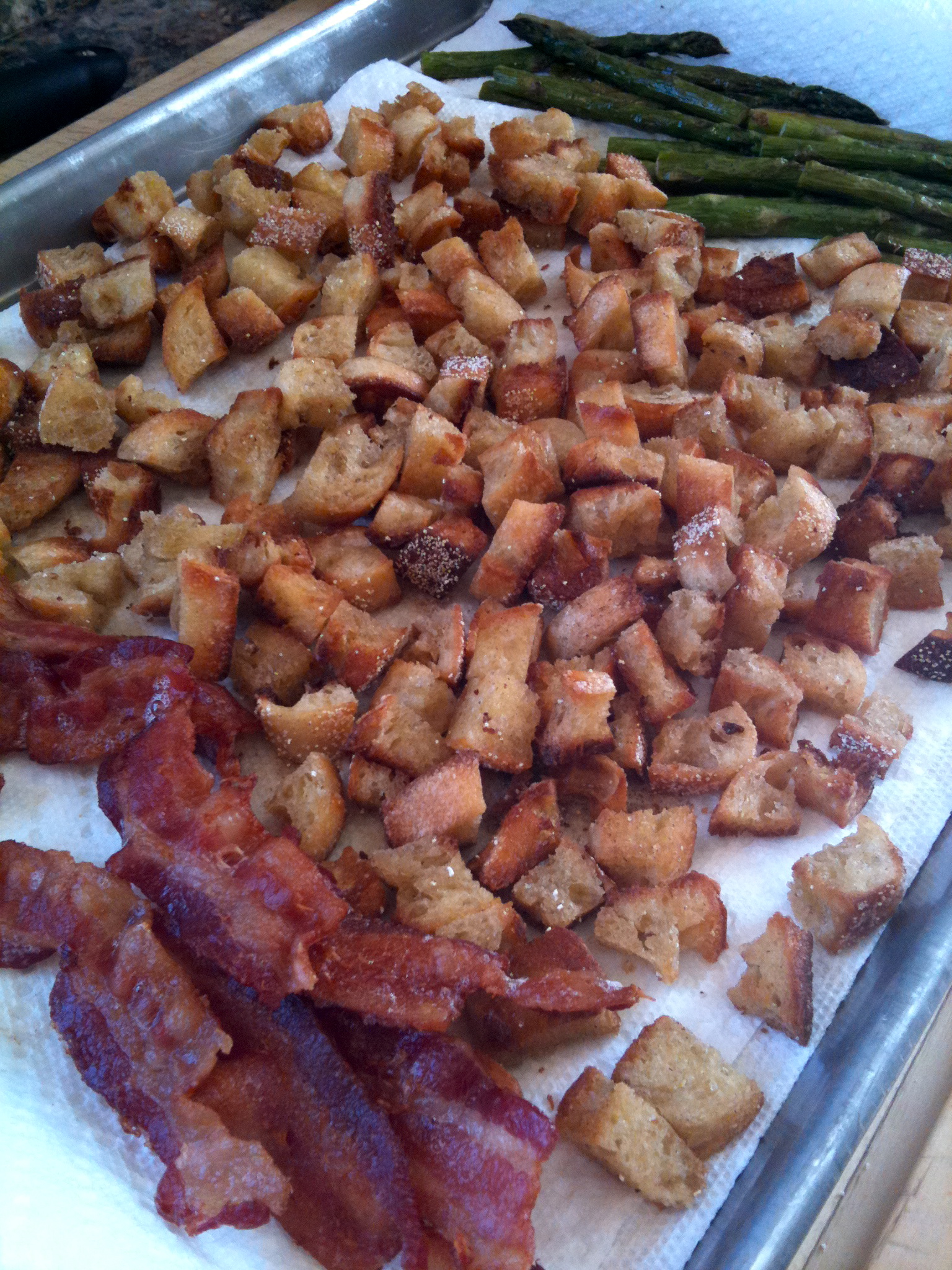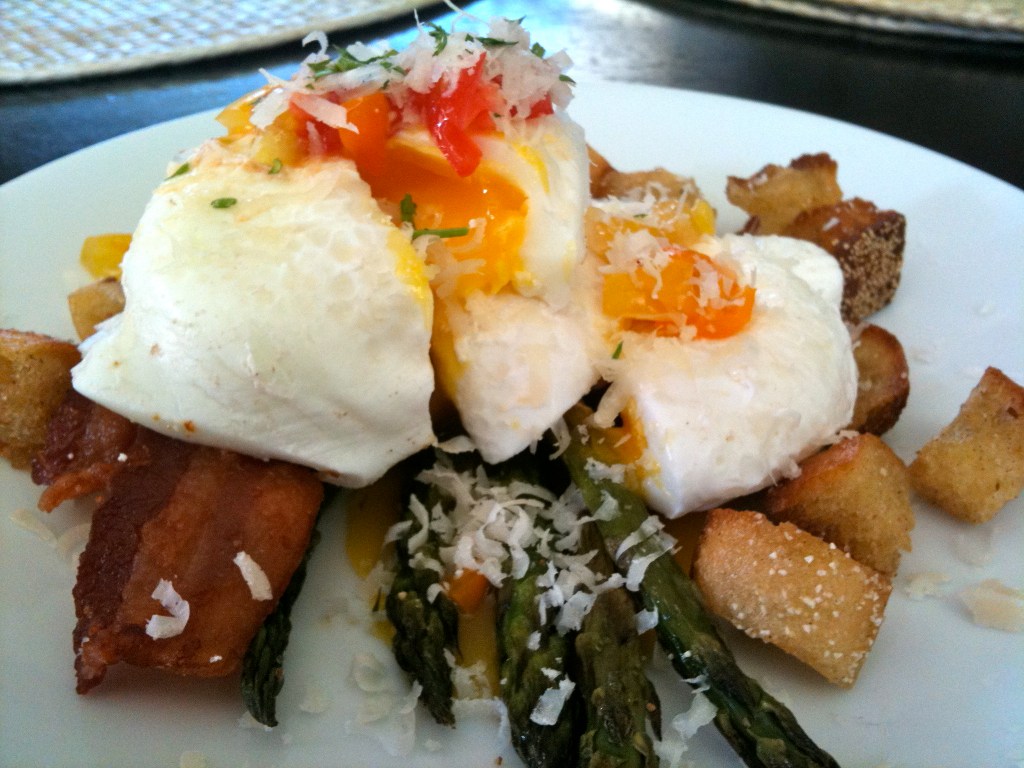 Place some asparagus and bacon on your plate, top with croutons. Add hot poached eggs on top of croutons and grate fresh Parmigiano Reggiano over the top. Eat right away and enjoy!