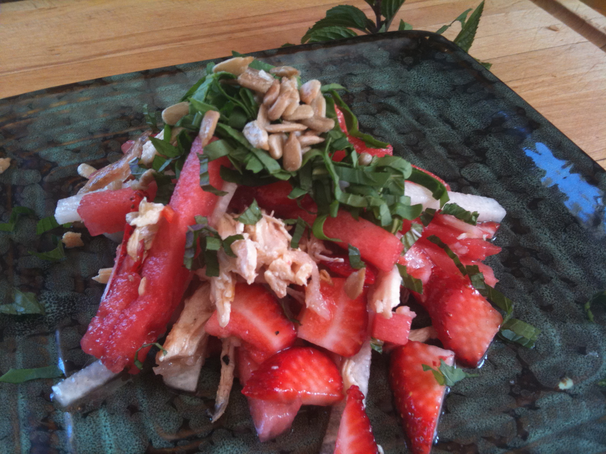 Clean and chop the mint and arugula, have all your items ready to toss for service. Put the strawberries, watermelon and chicken breast in a mixing bowl. Toss gently, add dressing and toss again with the mint and arugula. Transfer to service dish and garnish with roasted sunflower seeds.