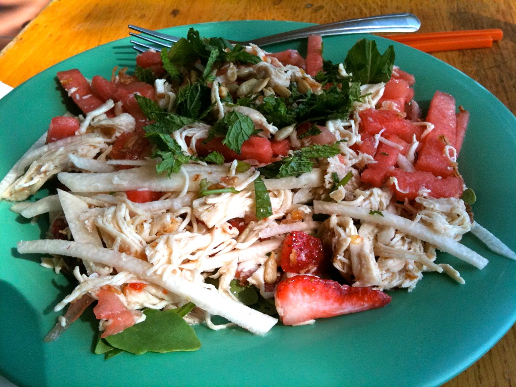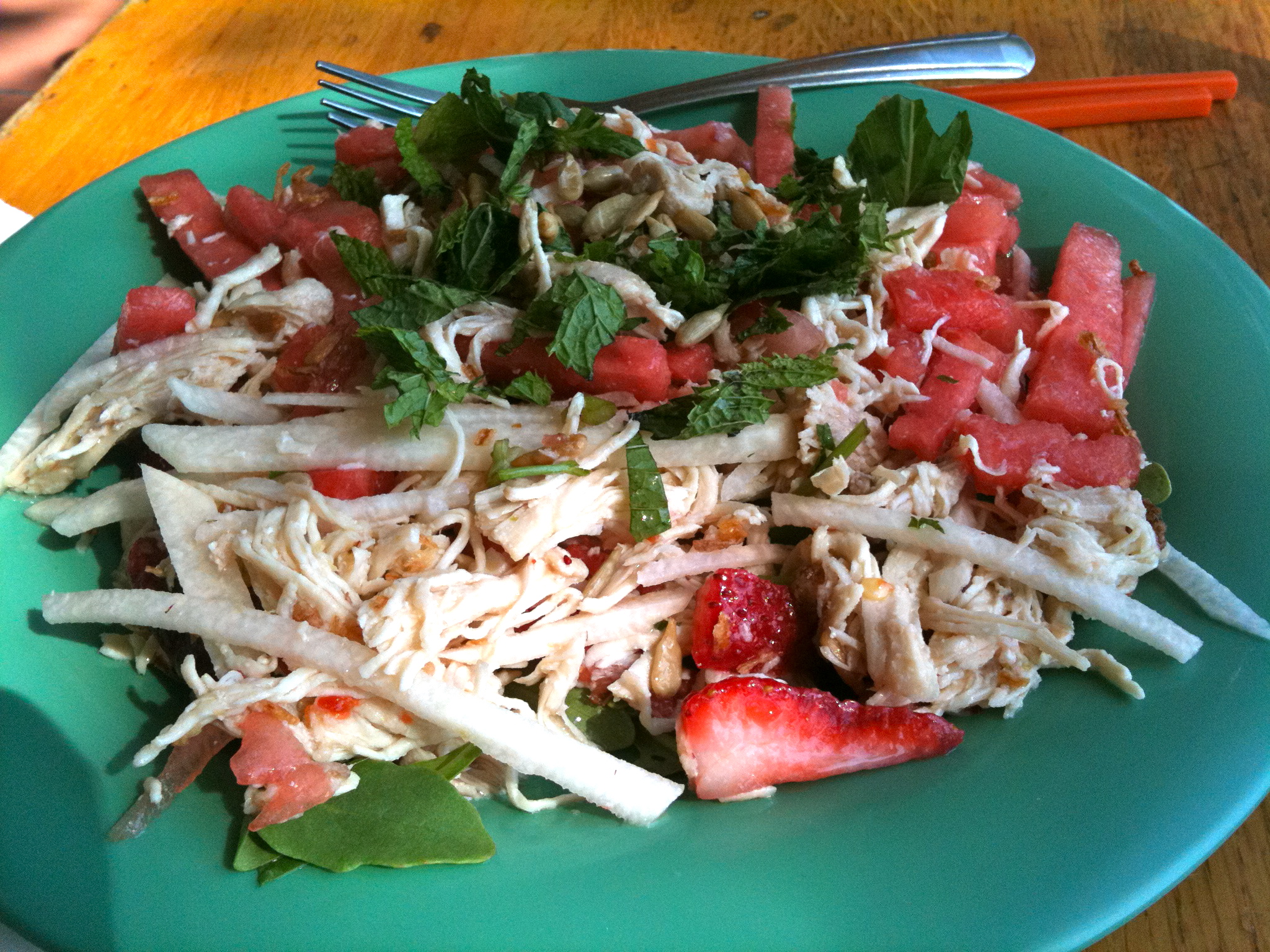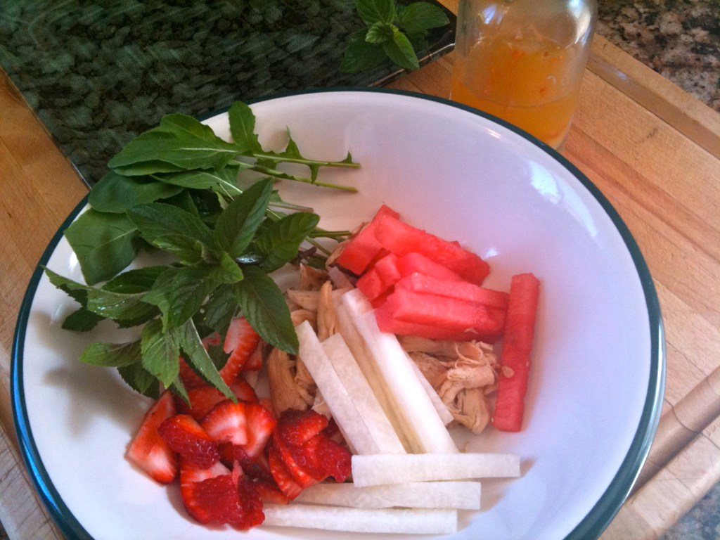 It’s all about the dressing (not one drop of oil in this dressing, seriously I promise) and the freshest, ripest ingredients. The soft crunch of the juicy watermelon, super sweet strawberries, extra crunchy jicama, tender chicken meat shredded thin all covered in the most amazing citrus dressing. Oh the greens, lets not forget the greens, spicy arugula and fresh mint, torn or cut in a fancy chiffonade and then topped with some roasted sunflower seeds or pumpkin seeds. Summer on a plate. Here is how you do it.