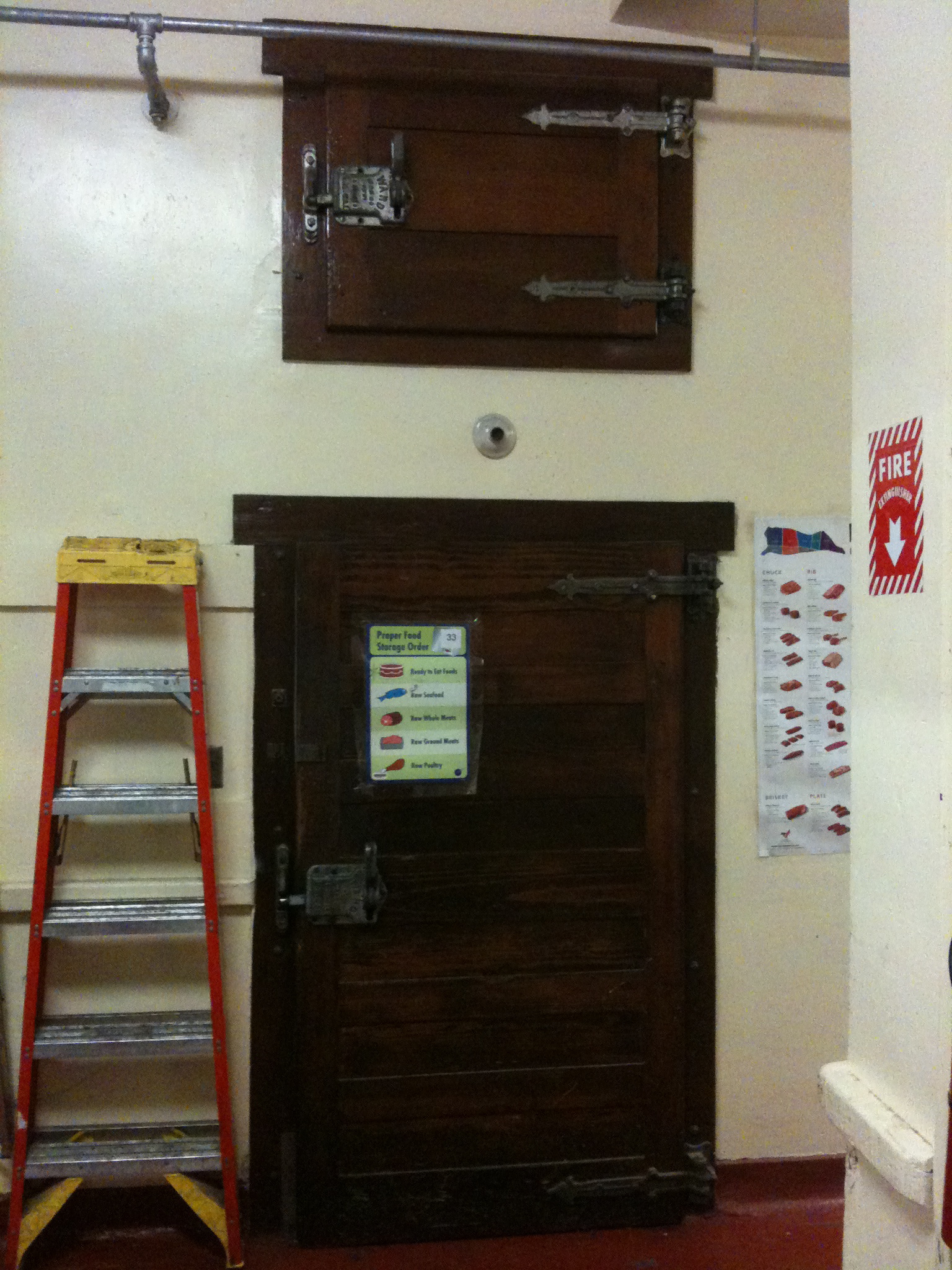 This is the last original wood walk in door, above it is where they used to keep huge chunks of ice to cool the section below it, before refrigeration. There are 5 or 6 old walk ins like these on one side of the kitchen and there are probably 10 more walk ins that are bit more modern throughout the kitchen.