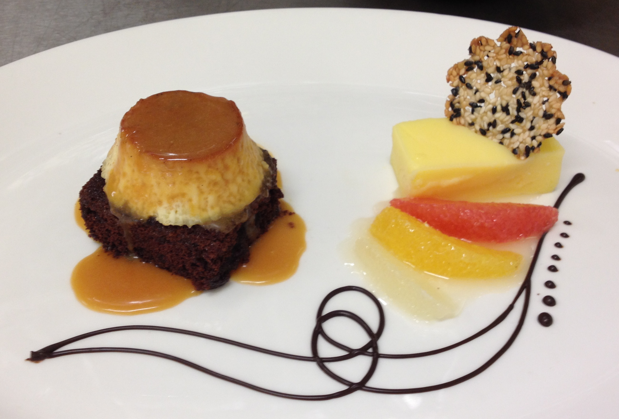 Chocolate Spice Cake topped with Fromage Blanc custard and caramel sauce. White chocolate lemon curd, citrus segments w/citrus sauce & a black and white sesame tuile. This was a dessert for a vintners dinner.