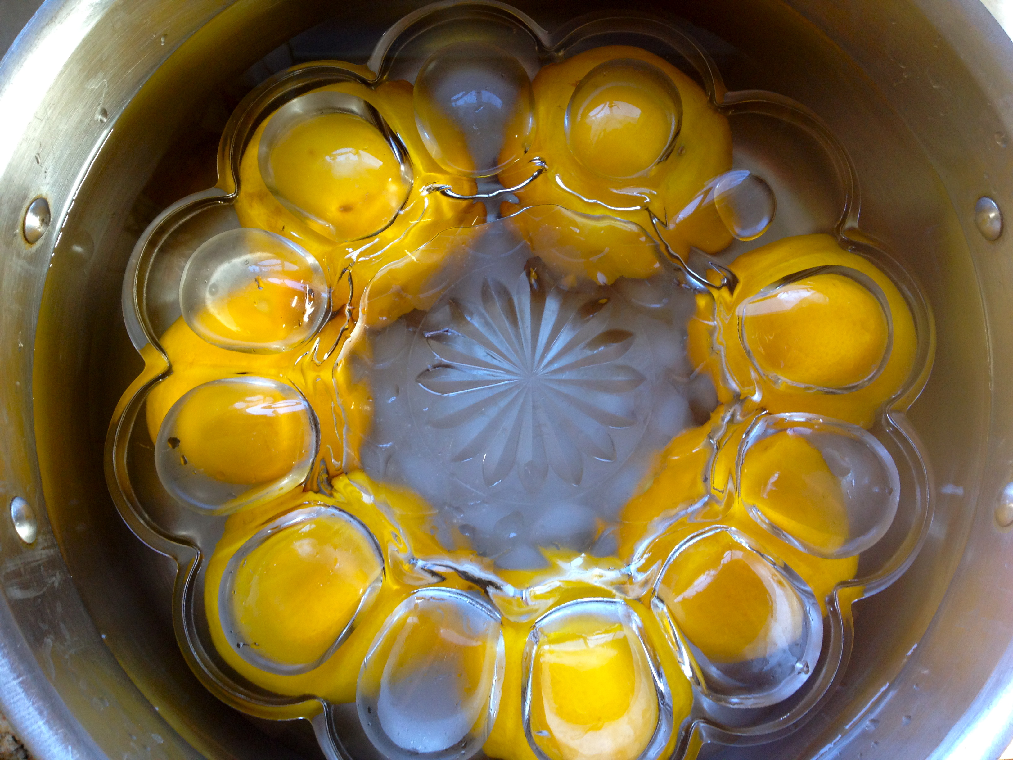 Assemble your clean lemons in a large pot of water, enough water to cover them while they bob around. Cover the lemons with a plate to keep the submerged. I used my deviled egg plate, worked perfectly.