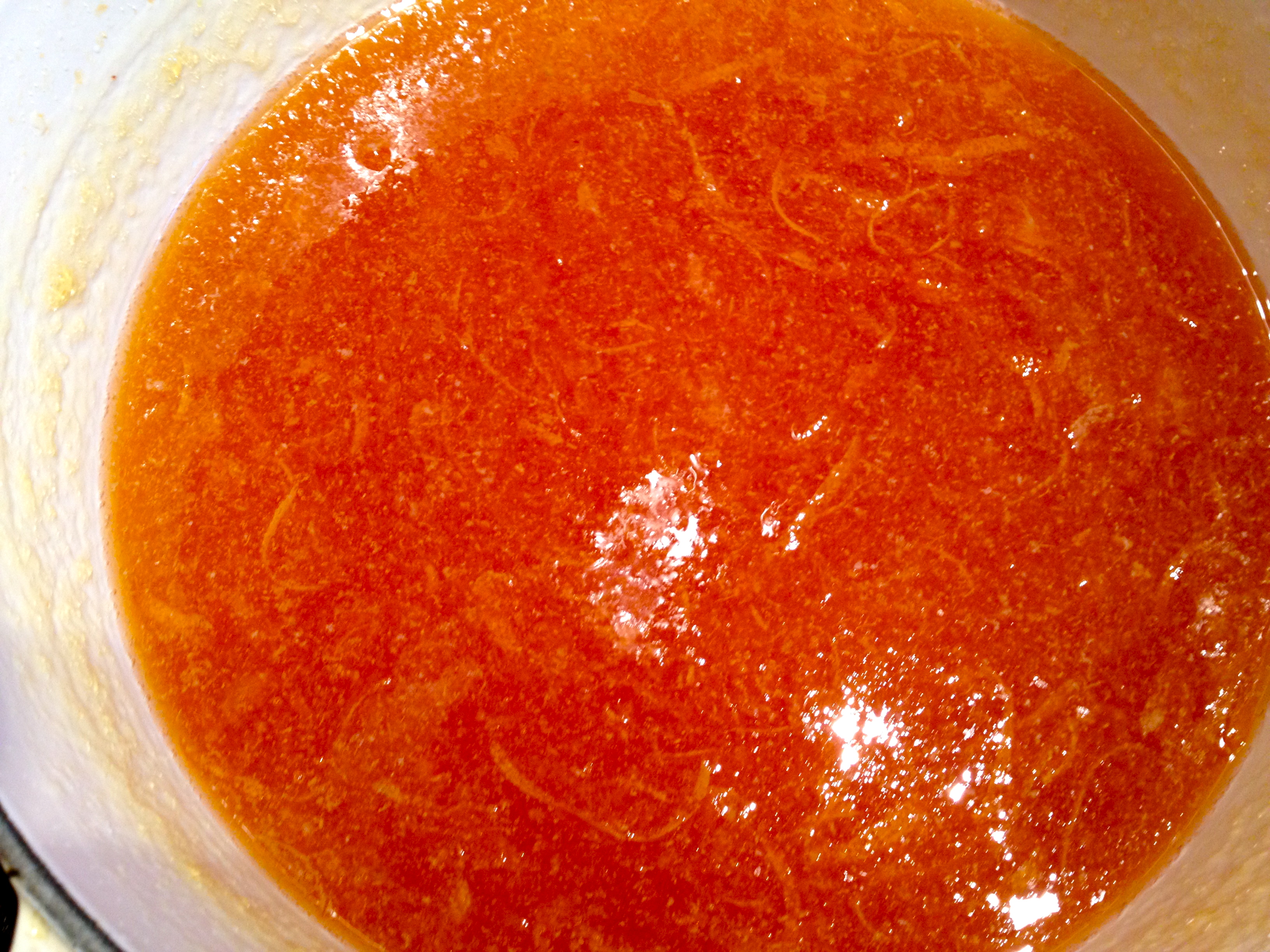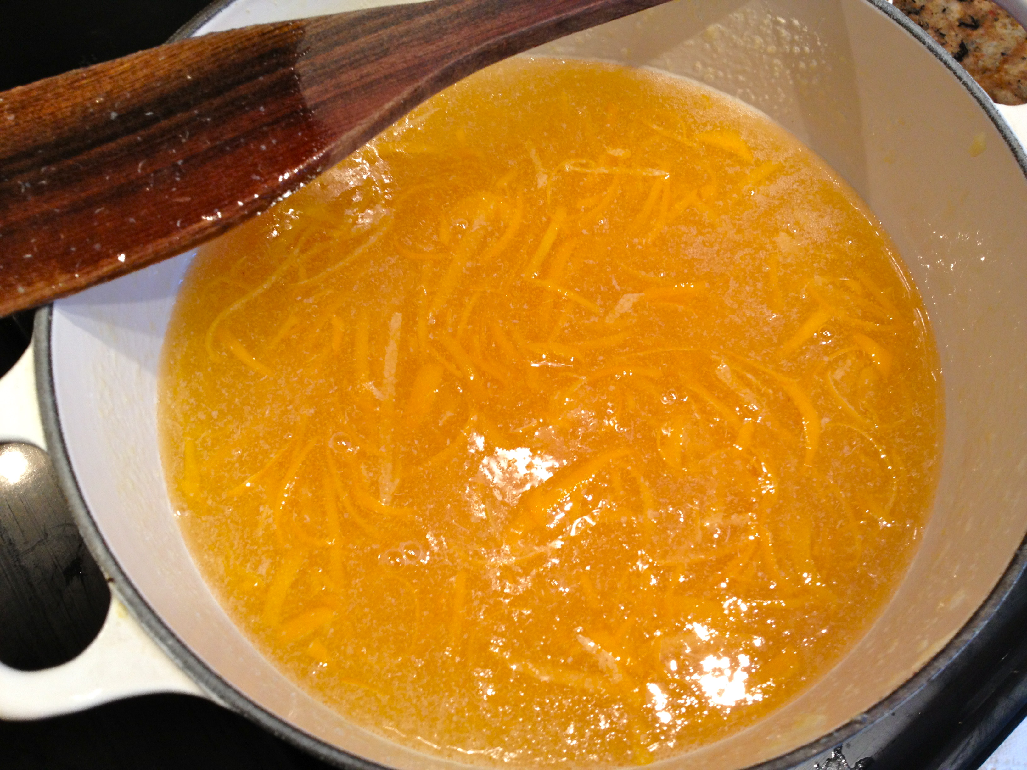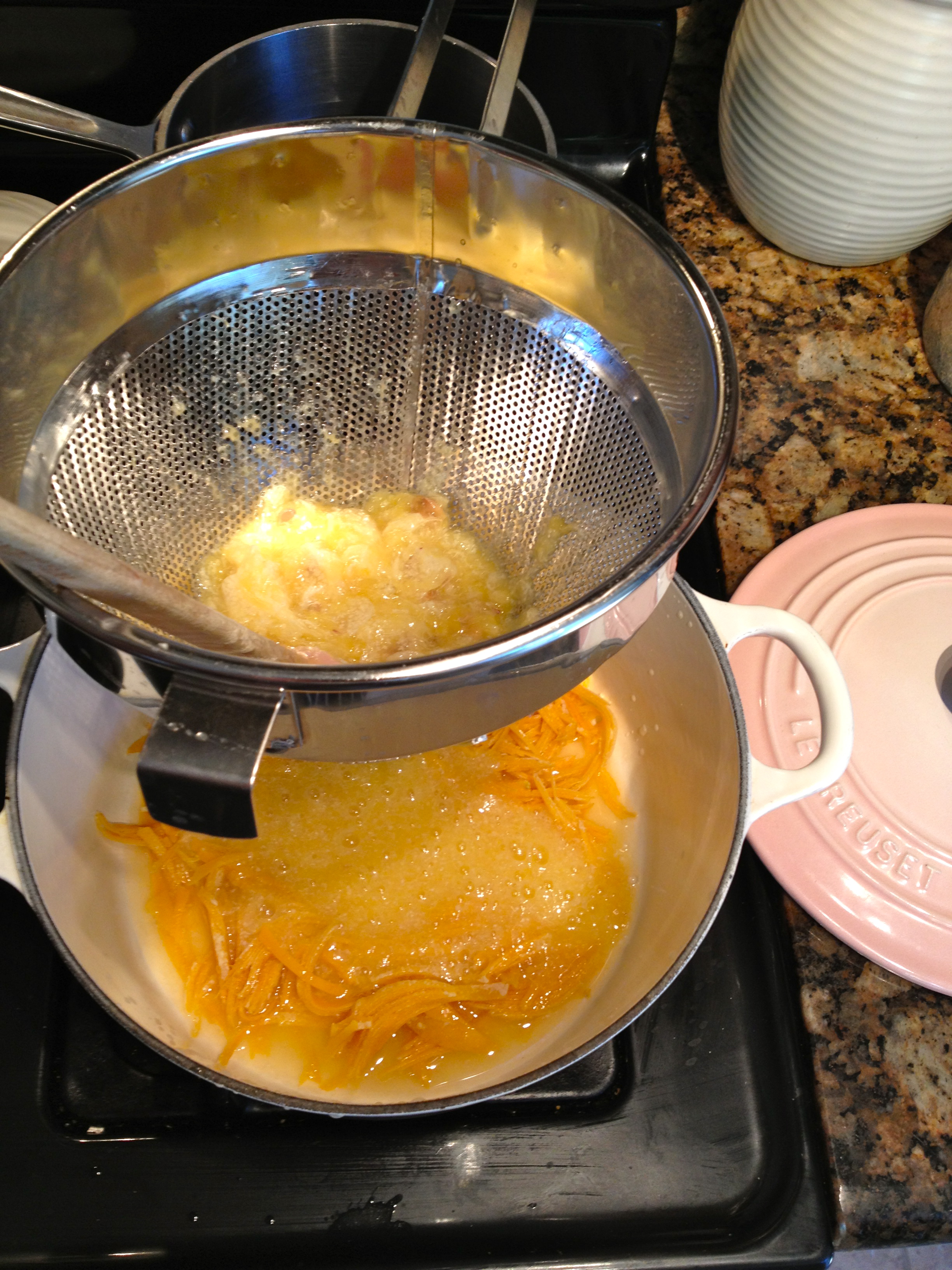 Place your expertly sliced rinds in a pale pink Le Creuset ( jk, I know not everyone is lucky enough to own this beautiful piece of cookware, I still squeal with girly glee every time I use it, thanks Jennay ) or a 4 qt sauce pot with reserved water from the boiling of the lemons. Grab a chinois/strainer, you will need a medium mesh chinois/strainer, do not use a fine mesh, you won’t get enough of the pulp through.