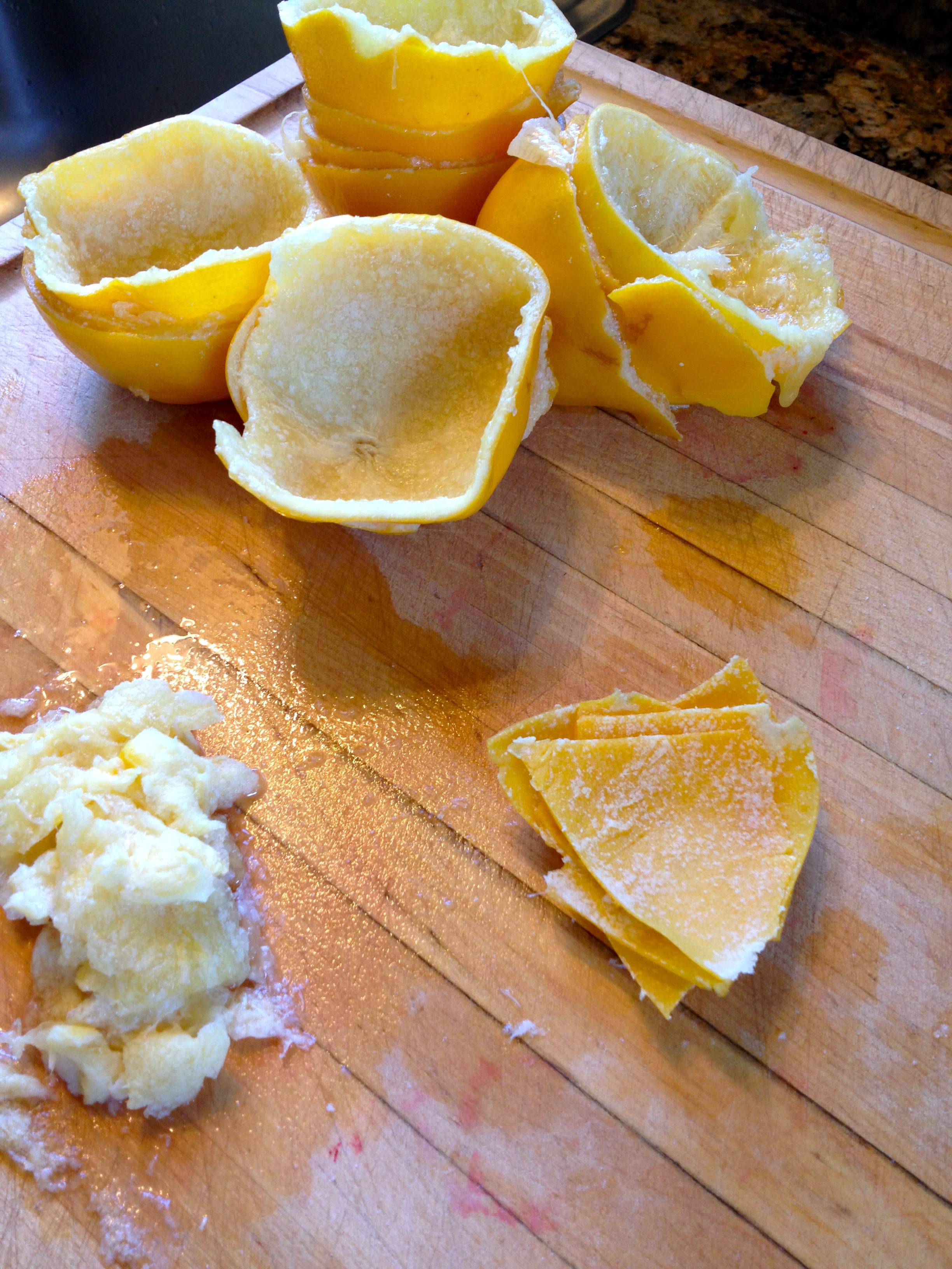 This is the point where I realized the thick skinned lemons would be much easier to work with. The meyer lemon skin is so thin and dainty, it really was like doing surgery, trying not to rip the rind to shreds. More on the final result with meyer lemons later. This step takes awhile be patient – make sure to remove the pith…… pith = bitter. Here is an after shot