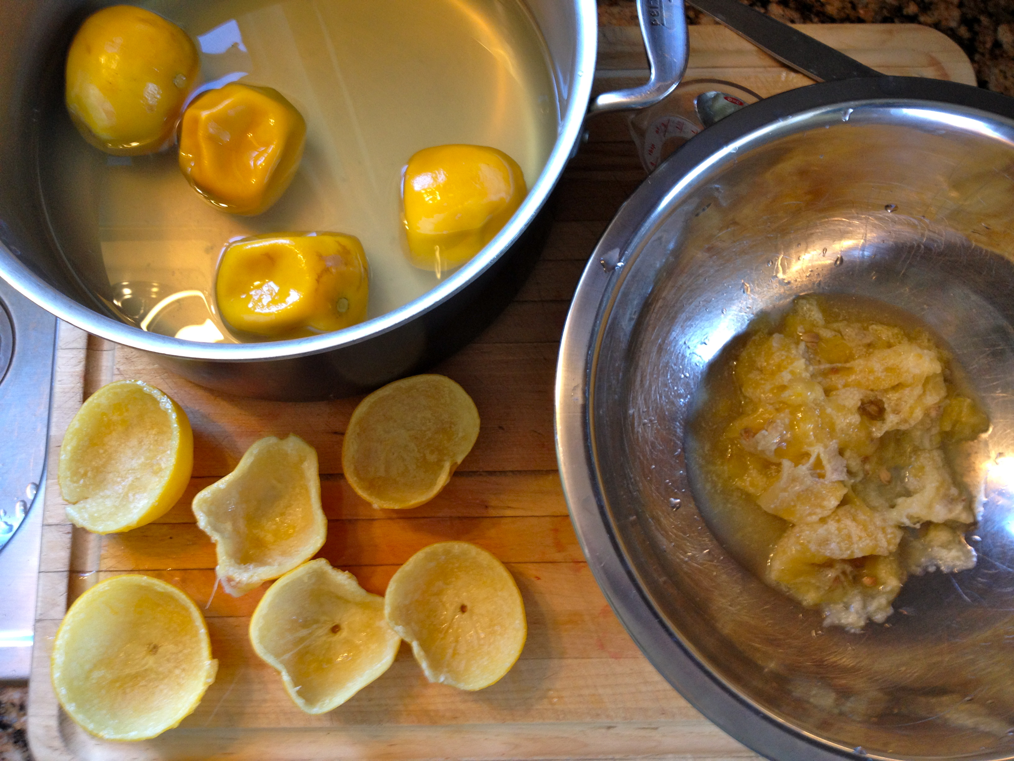 The sauce pot should have the lemon rinds, reserved lemon water from boiling 1 1/4 cups and all the pulp you could muscle through your chinois. Stir in 5 1/2 cups of sugar (if using meyer lemons do 5 cups of sugar) over a high heat, when the mixture begins to simmer, set your heat for a low simmer and cook for 1-2 hours, the mixture will darken as it cooks. Starting out like this