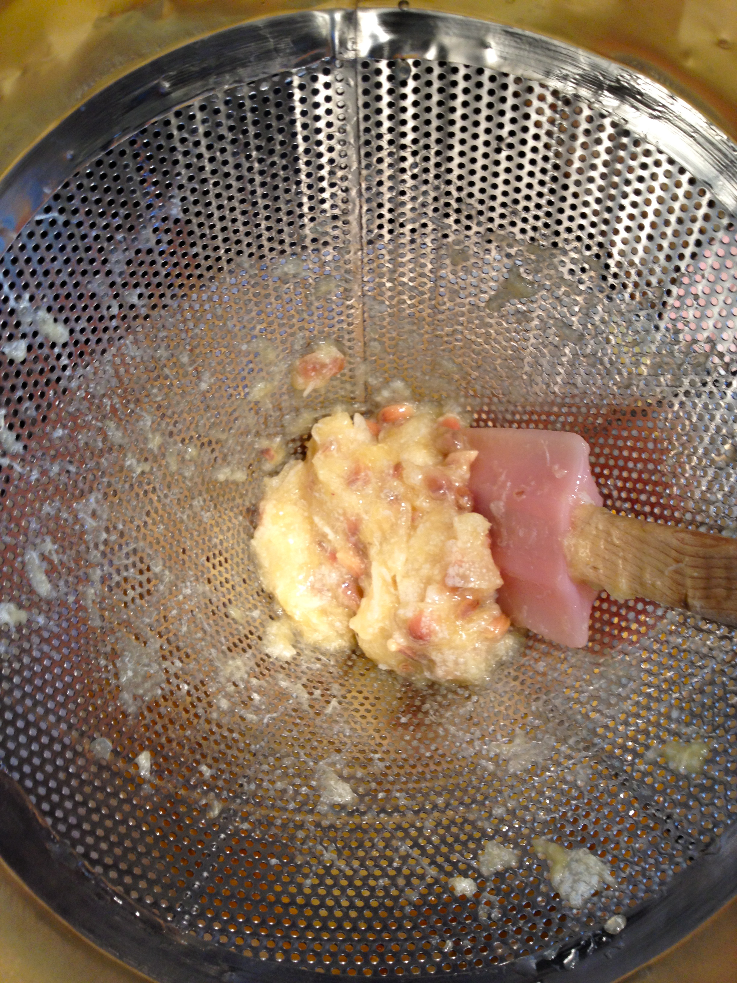 Push the pulp against the side of the chinois to get as much pulp through as possible. You want very little left in the strainer, like this.
