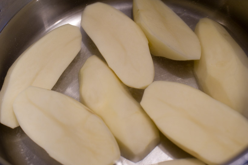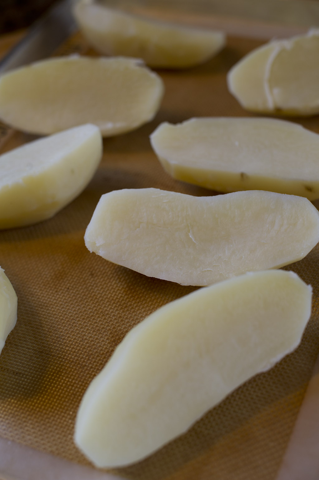 2 1/2 pounds large russet baking potatoes (2 large halved lengthwise or 4 small, peeled and rinsed)