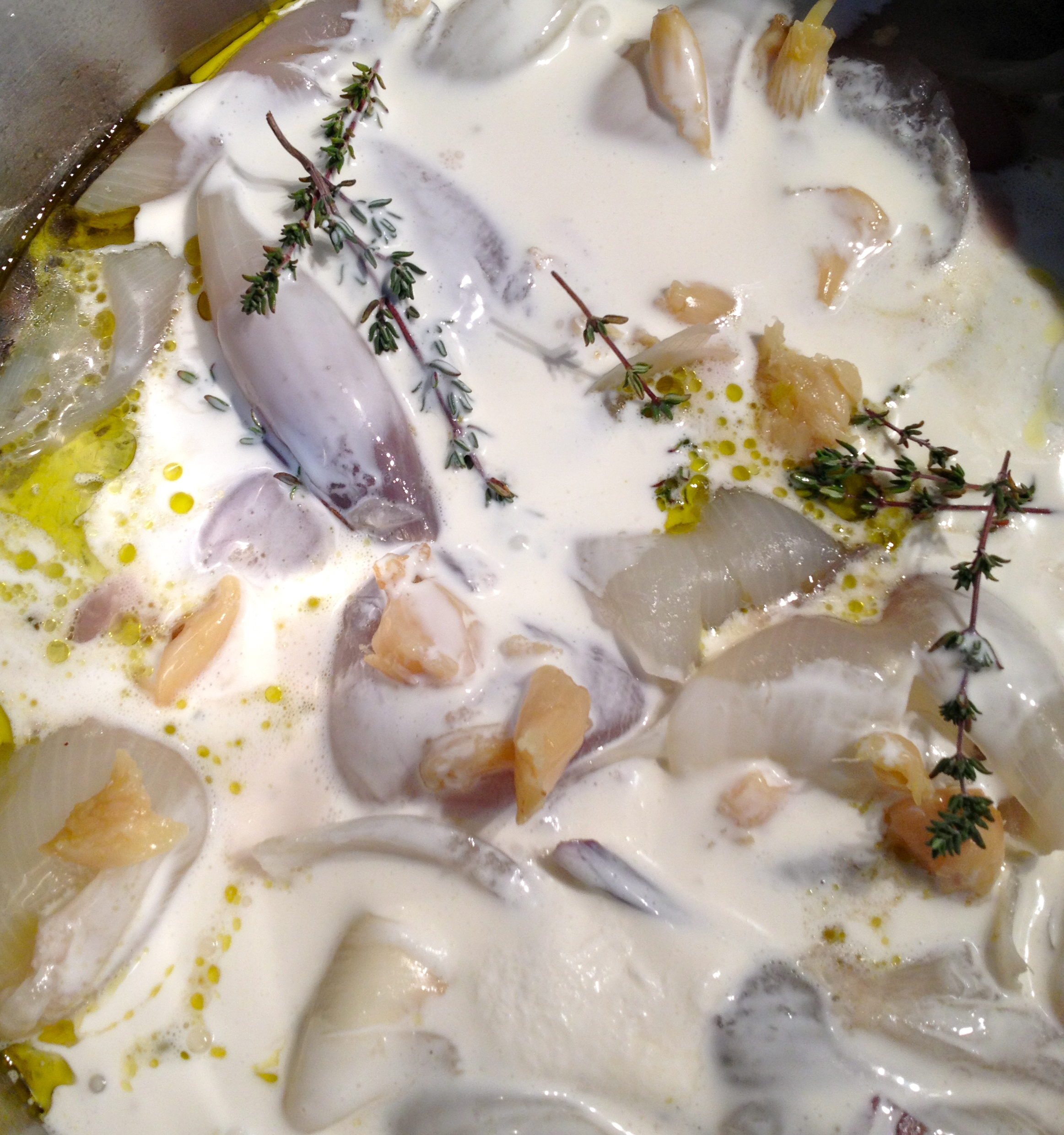 Squeeze the soft garlic cloves from the whole head of garlic and add to the onion centers, as well as the cream, teaspoon of salt and thyme leaves. As you see here I spaced out and added more sprigs, avoid this and you won’t have to fish out the stems later after they’ve cooked. Bring the mixture to a boil