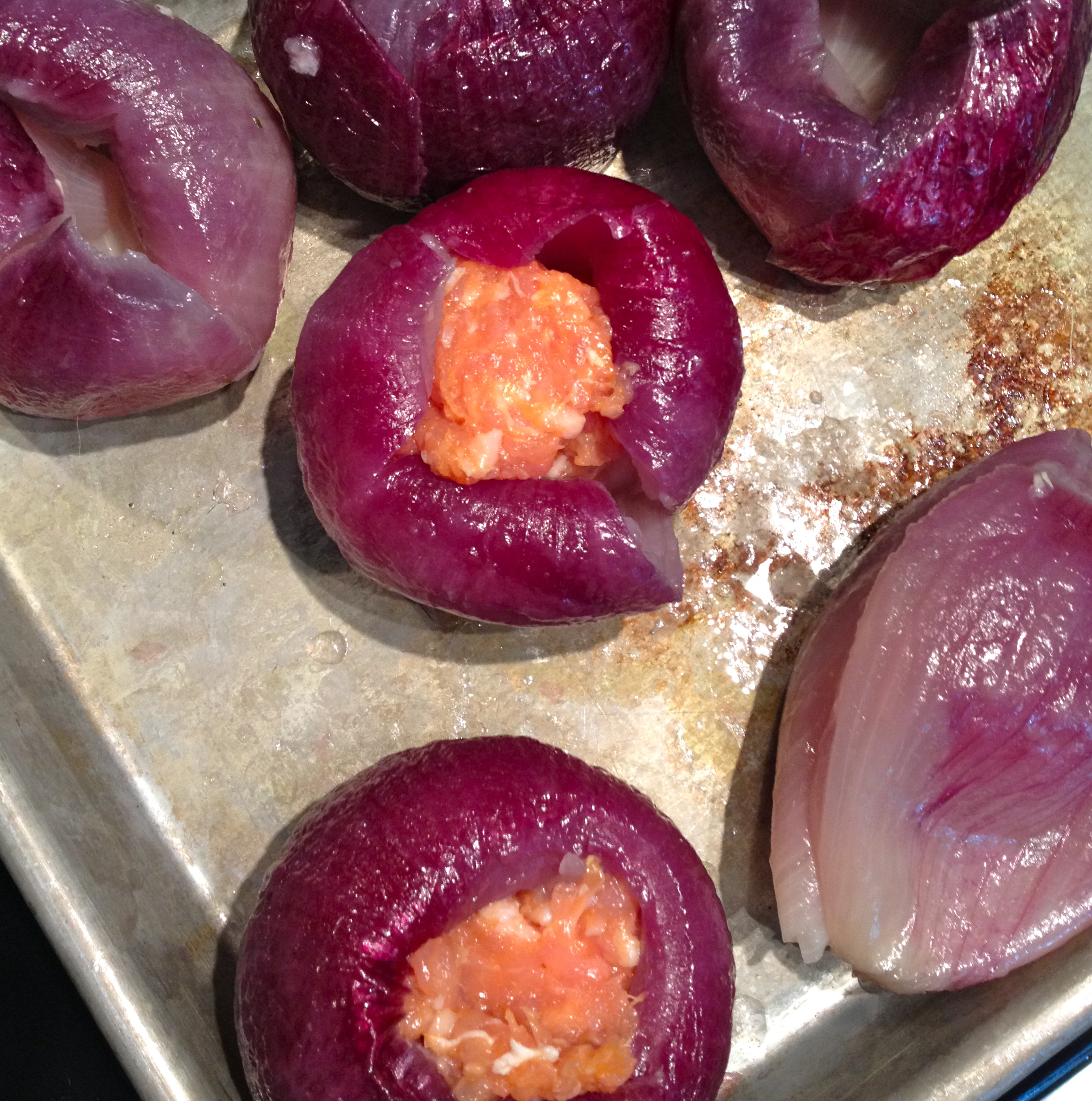 When the onions are cool enough to handle use a small spoon to remove the centers of the onions. Don’t remove too much and or too little. Stuff the onions with the uncooked sausage, set aside.